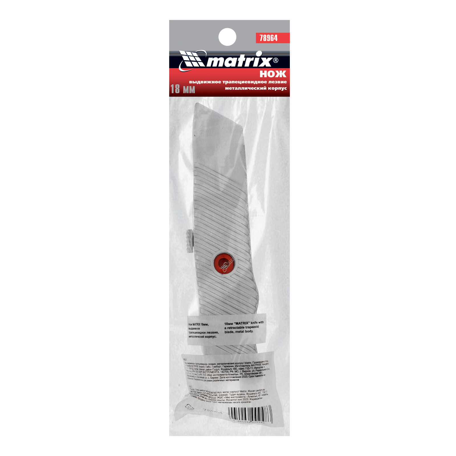 | Прочие особенности и свойства | Нож MATRIX 18 мм выдвижное трапециевидное лезвие 78964 предназначен для разрезания бумаги, картона, обоев, линолеума и т.п. Корпус выполнен из металла и скреплен пластиковым винтом. Стальное лезвие трапецевидной формы выдвигается из корпуса при помощи специального рычага. |