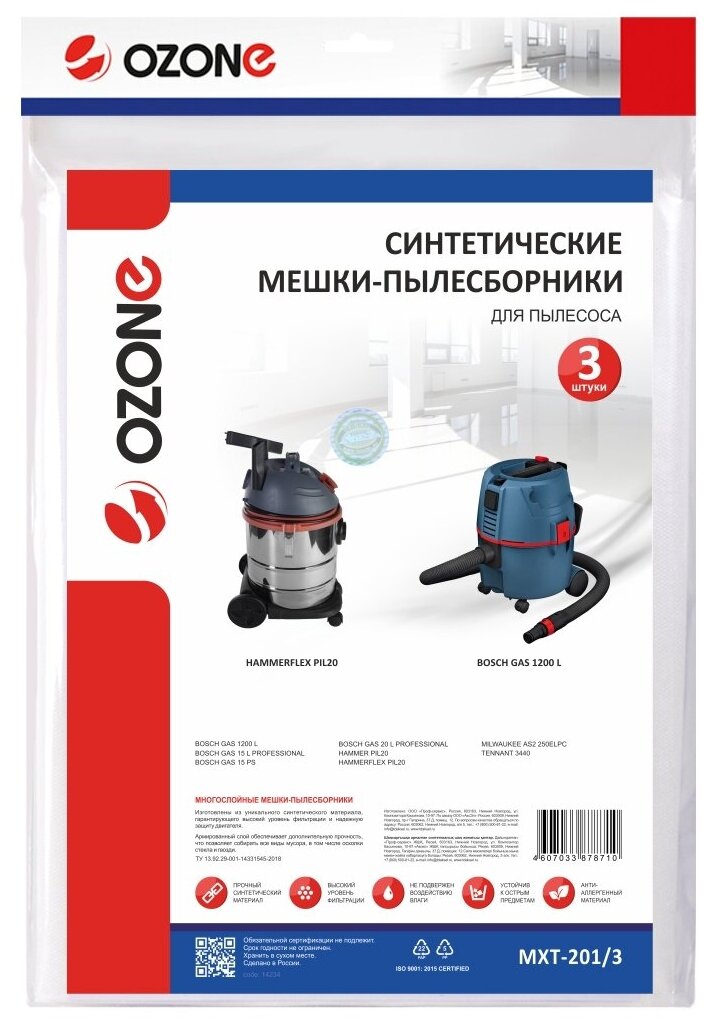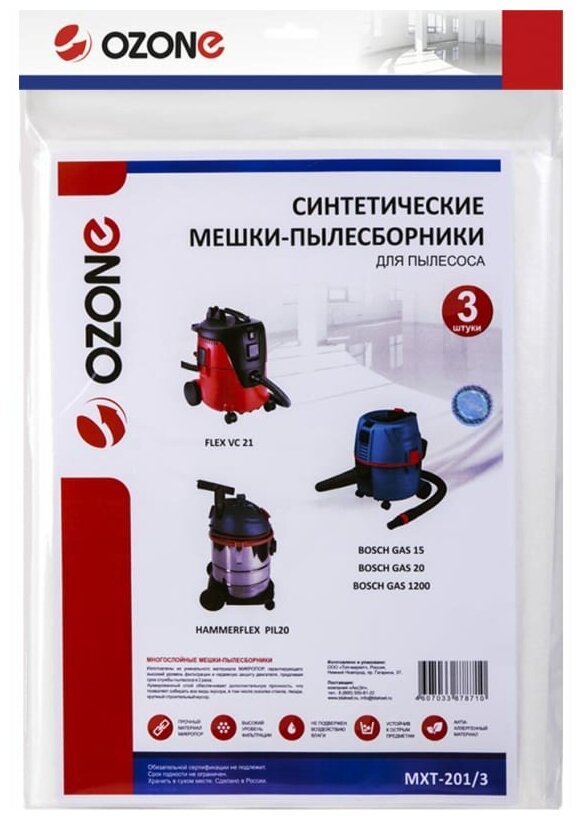 Благодаря изготовлению из трехслойного материала, слои которого удерживаются вместе за счет термоскрепления, мешки Ozone отличаются повышенной прочностью и выдерживают значительную нагрузку. Пылесборники предполагают однократное применение и снабжаются картонными клапанами для крепления внутри пылесоса.
