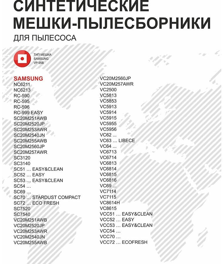 | Совместимость | SAMSUNG RC-999 EASY , SAMSUNG SC52 … EASY , SAMSUNG VCC52 … EASY , SAMSUNG SC51 … EASY&CLEAN , SAMSUNG SC53 … EASY&CLEAN , SAMSUNG VCC51 … EASY&CLEAN , SAMSUNG VCC53 … EASY&CLEAN , SAMSUNG SC72 … ECO FRESH , SAMSUNG VCC72 … ECOFRESH , SAMSUNG VC63 … LIBEC |