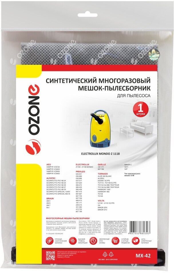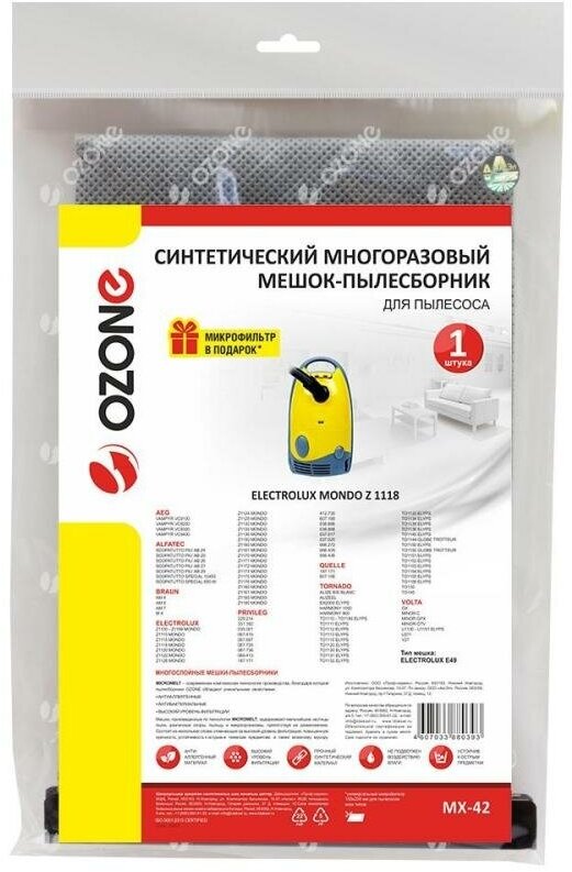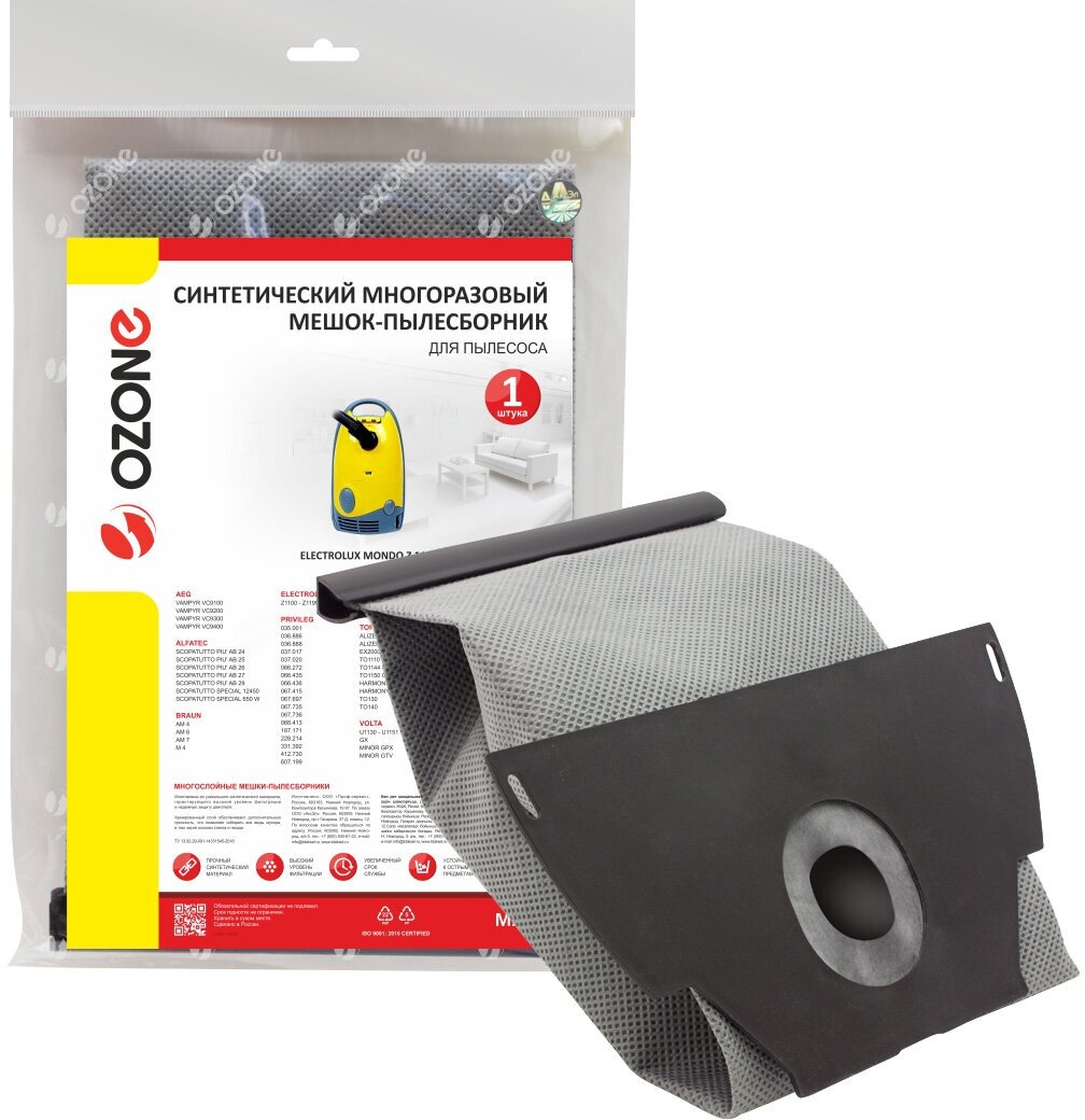 Ozone подходит для пылесосов ELECTROLUX, AEG, ALFATEC, PRIVILEG, Ozone, TORNADO, VOLTA.