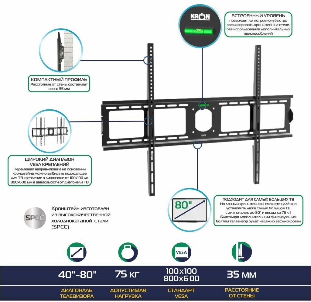 | Дополнительно | Для телевизоров диагональю 40"-80", Максимальная нагрузка |