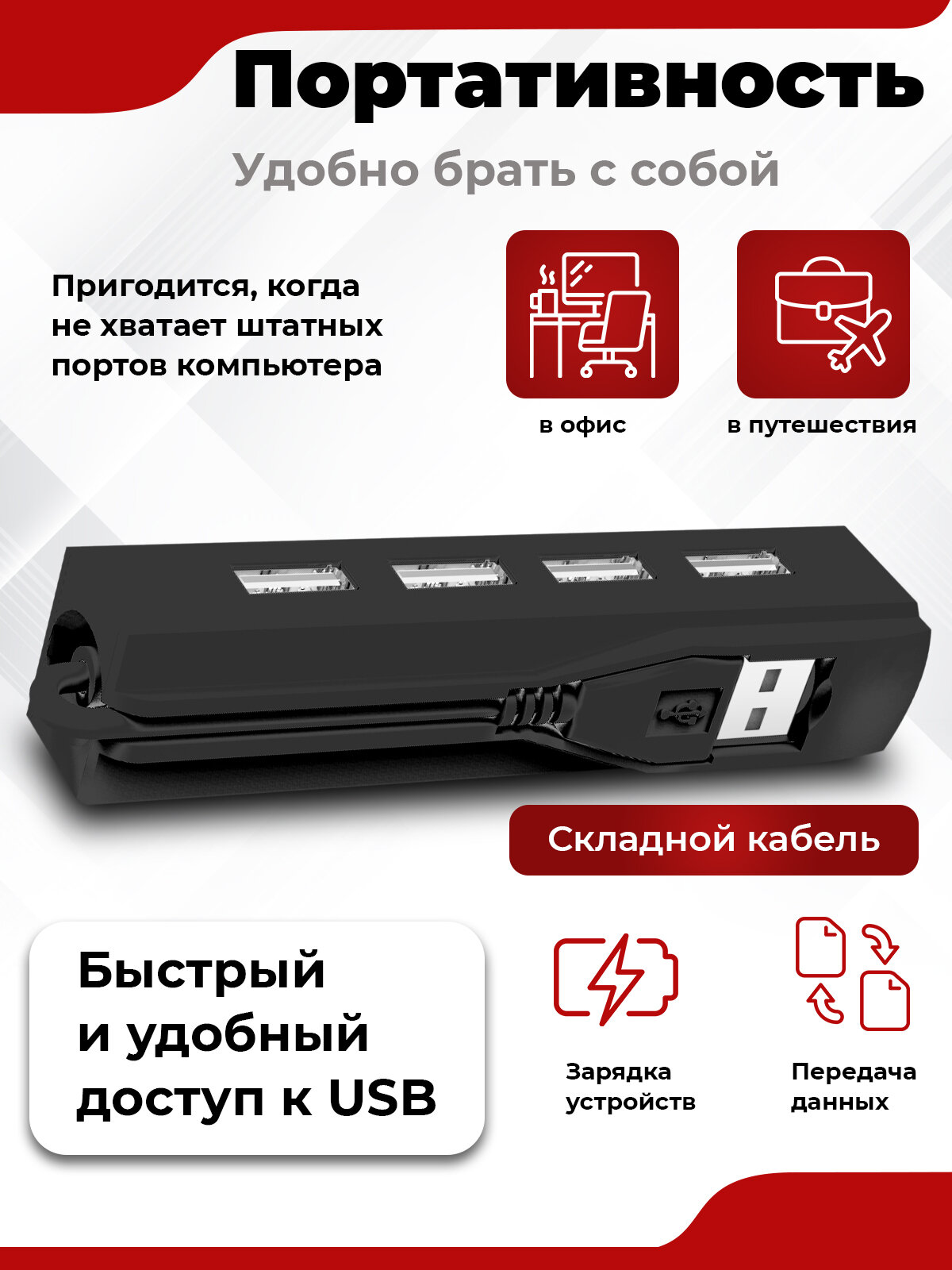 itmix — четырёхпортовый USB-разветвитель (USB-хаб). Предназначен для подключения клавиатуры, мыши, USB-флэшки, фотоаппарата, смартфона, планшета к компьютеру или ноутбуку. Это полезное устройство пригодится и дома, и в офисе, и в путешествиях, когда не хватает штатных портов компьютера или хочется иметь к ним удобный доступ.