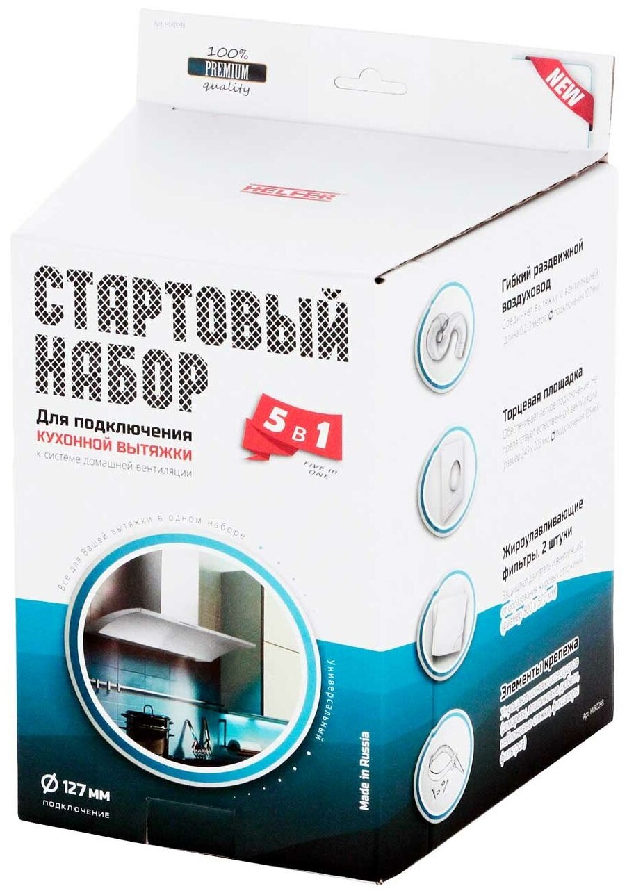 Техника для дома Helfer Стартовый набор HELFER предназначен для подключения кухонной вытяжки к системе домашней вентиляции. В наборе есть все необходимые составляющие, которые позволят быстро и легко установить вытяжку, чтобы она радовала своей функциональностью. Гибкий раздвижной воздуховод обеспечивает надежность соединения самой вытяжки с вытяжным отверстием помещения. Торцевая площадка для декоративного оформления вентиляционного отверстия в стене здания гарантирует легкое подключение. Кроме того, она оснащена решеткой для естественной вентиляции. Жироулавливающие фильтры эффективно защитят двигатель и вентиляционный канал кухонной вытяжки от образования жировых отложений. Элементы крепежа, входящие в комплект упрощают монтаж аксессуаров.