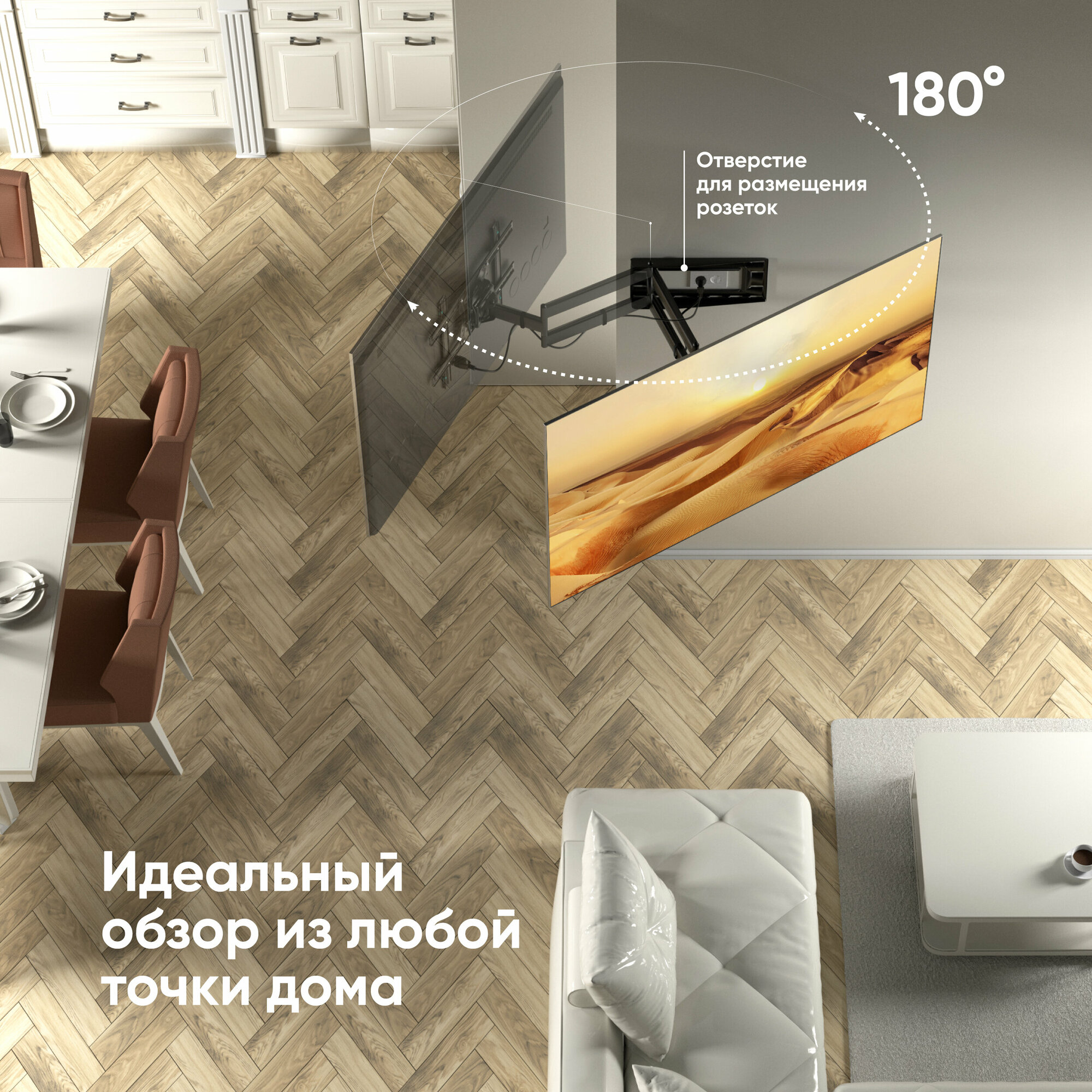 Данная модель обеспечивает все возможные регулировки экрана телевизора: наклон -5 до +15 градусов и поворот в стороны до 180 градусов. Благодаря этому вы сможете найти оптимальную позицию экрана, чтобы наслаждаться телевизором из любой точки комнаты.