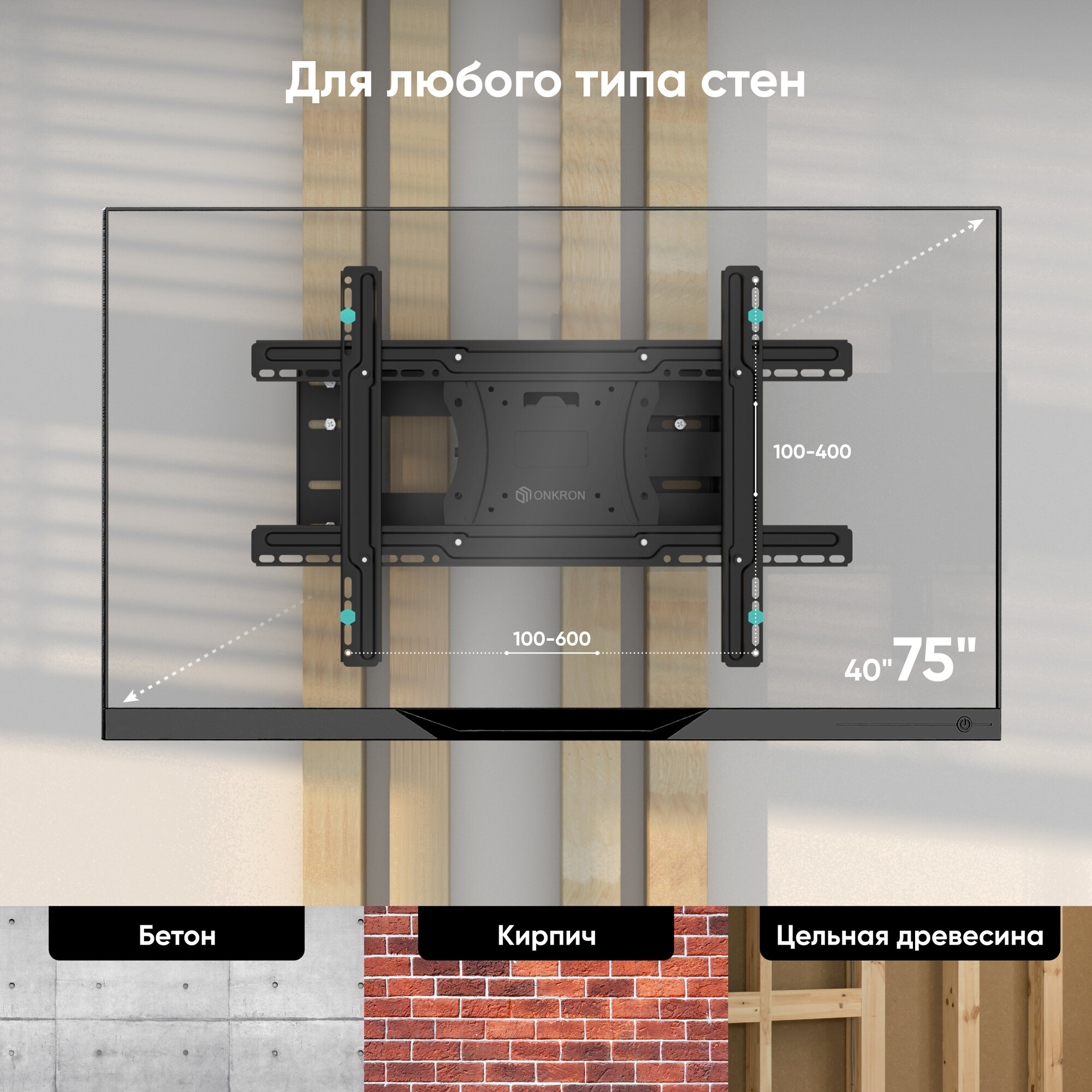 ONKRON станет прекрасным выбором для техники размером 40-70 дюймов. Благодаря надежной конструкции модель выдержит нагрузку до 68,2 кг.