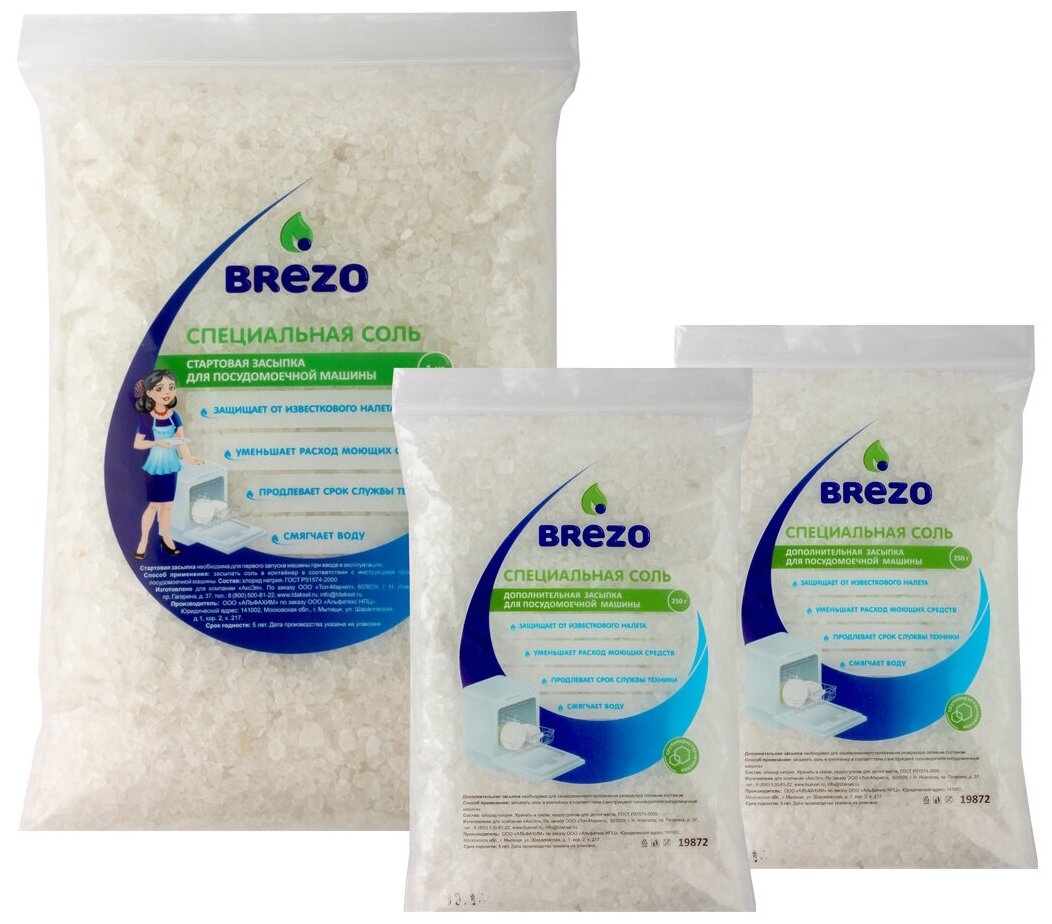 Защищает от известкового налета. Уменьшает расход моющих средств. Продлевает срок службы техники. Специальная крупнокристаллическая соль BREZO применяется в качестве стартовой и дополнительной засыпки для всех видов посудомоечных машин. Соль высокой степени очистки эффективно защищает внутренние детали и нагревательные элементы посудомоечной машины от образования накипи, а посуду – от появления на ней известкового налета. Благодаря уникальной структуре крупных кристаллов (4-6 мм) уменьшается расход самой соли и моющих средств в 2-3 раза. Соль смягчает жесткую воду и позволяет продлить срок службы посудомоечной машины. Стартовая засыпка необходима для первого пуска посудомоечной машины при вводе ее в эксплуатацию. Дополнительная засыпка нужна для своевременного пополнения резервуара солевым составом.