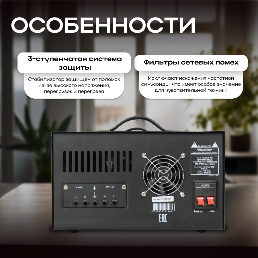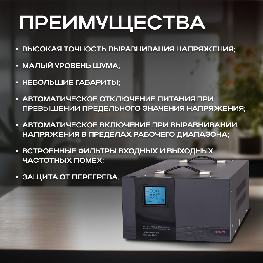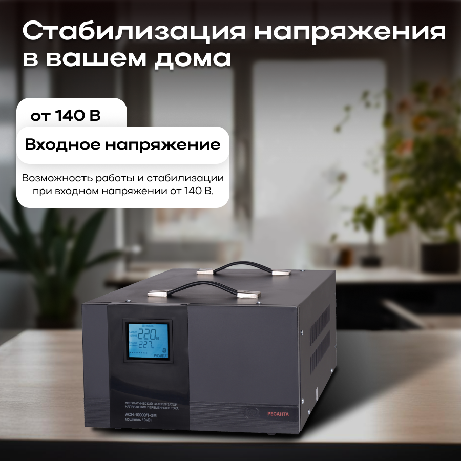 Ресанта способен работать с суммарной нагрузкой до 10 кВт, что делает стабилизатор идеальным выбором для помещений с множеством электроприборов.