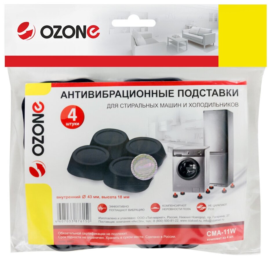 Антивибрационные подставки OZONE белые черные эффективно поглощают вибрацию, компенсируют неровности пола. Устанавливаются на ножки холодильников и стиральных машин. Подставки для стиральных машин предназначены для устранения шума и вибрации, возникающих в процессе работы крупной бытовой техники. Антивибрационная подставка под стиральную машинку - подходит для всех типов неровного и наклонного пола, регулирует баланс, предотвращает скольжение, поглащает и значительно снижает шум. Антивибрационные подставки обладают амортизирующим эффектом, сильной прочностью и долговечностью. Оптимальный размер позволяет легко и просто устанавливать подставки под ножки приборов. Силиконовые подставки можно использовать : как подставки для стиральных машин, подставки для посудомоечных машин, подставки для холодильника, подставки для холодильных и морозильных камер. Количество предметов в упаковке, шт: 4