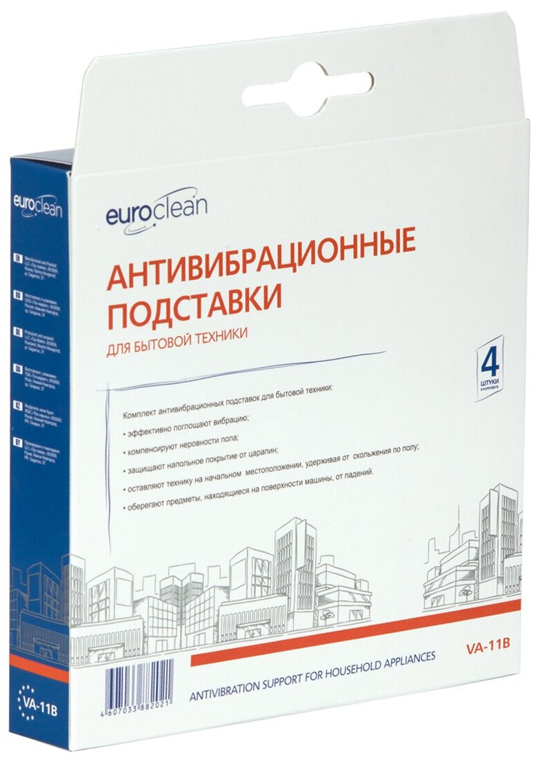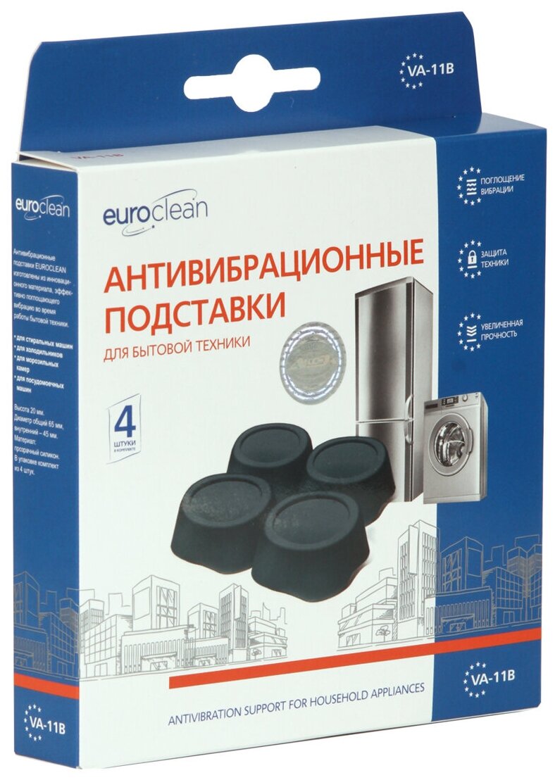 Антивибрационные подставки Euro Clean VA-11произведены из специального полимерного высокопрочного материала и отлично избавляют от шума и вибрации во время работы прибора. Также подставки защищают напольное покрытие (ламинат, линолеум, паркет) от вмятин и разрывов.