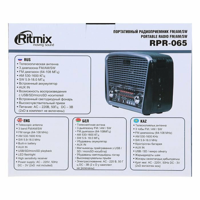 | Прочие особенности и свойства | Ritmix RPR-065 – портативный трёхдиапазонный радиоприёмник, охватывающий в том числе и FM-диапазон. Дополнительная функция – воспроизведение MP3-файлов с карт памяти или USB-флэшки. Устройство снабжено встроенным фонарём повышенной яркости.,,Портативный трёхдиапазонный радиоприемник FM / AM / SW,Функция MP3-плеера (читает файлы с microSD/SD/USB носителей),Яркий встроенный фонарь,Питание от встроенного аккумулятора, от сети 220В, от батареек типа D (2 штуки, в комплект не входят),Телескопическая антенна 360° для уверенного приёма,AUX IN |