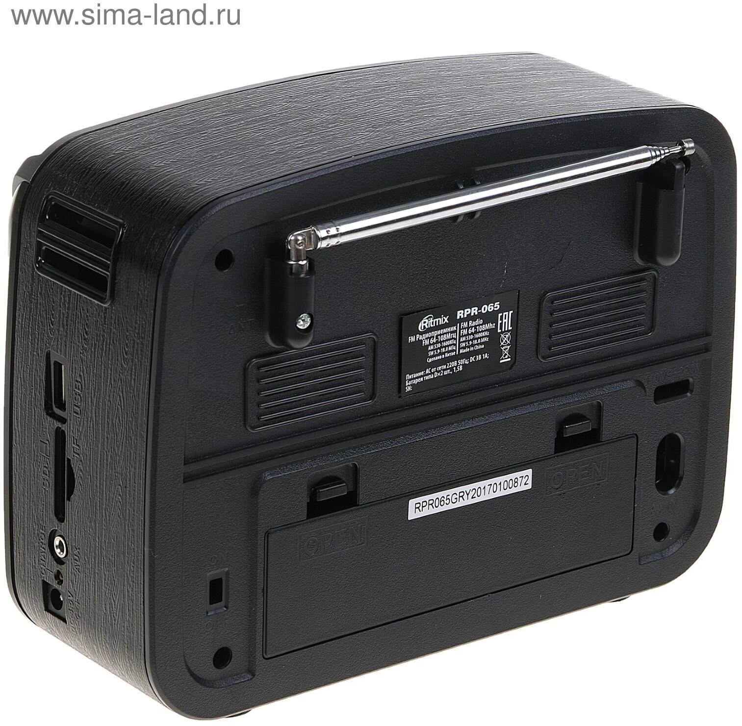 | Особенности | ФМ радиопримник 3диапазонный ФМ/КВ/СВ, AUX вход, встроенный мр3 плеер, воспроизведение с micro SD и SD карт памяти или USB флэш носителей, встроенный аккумулятор, телескопическая антенна. Питание АС 220В 50Гц / от аккумулятора 1А 3В/ от батареек 2 шт |