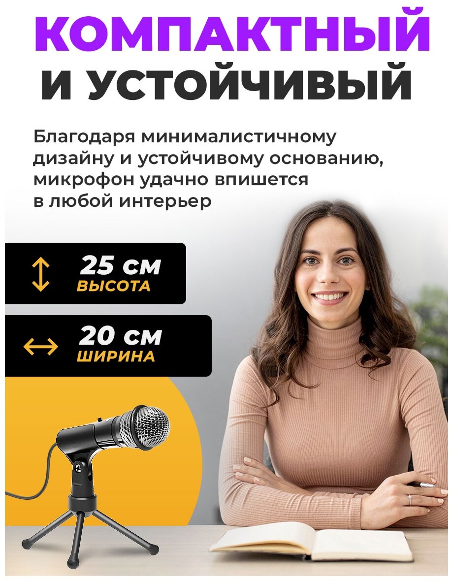 | Прочие особенности и свойства | Конденсаторный микрофон на штативе-подставке, позволяющей комфортно расположить его на рабочем столе или другом удобном для вас месте. Предназначен для деятельности в таких сферах как:интервью, презентации, skype, звукозапись, игры, стриминг. Наличие переключателя on/off позволяет в любое время отключить микрофон одним движением. |