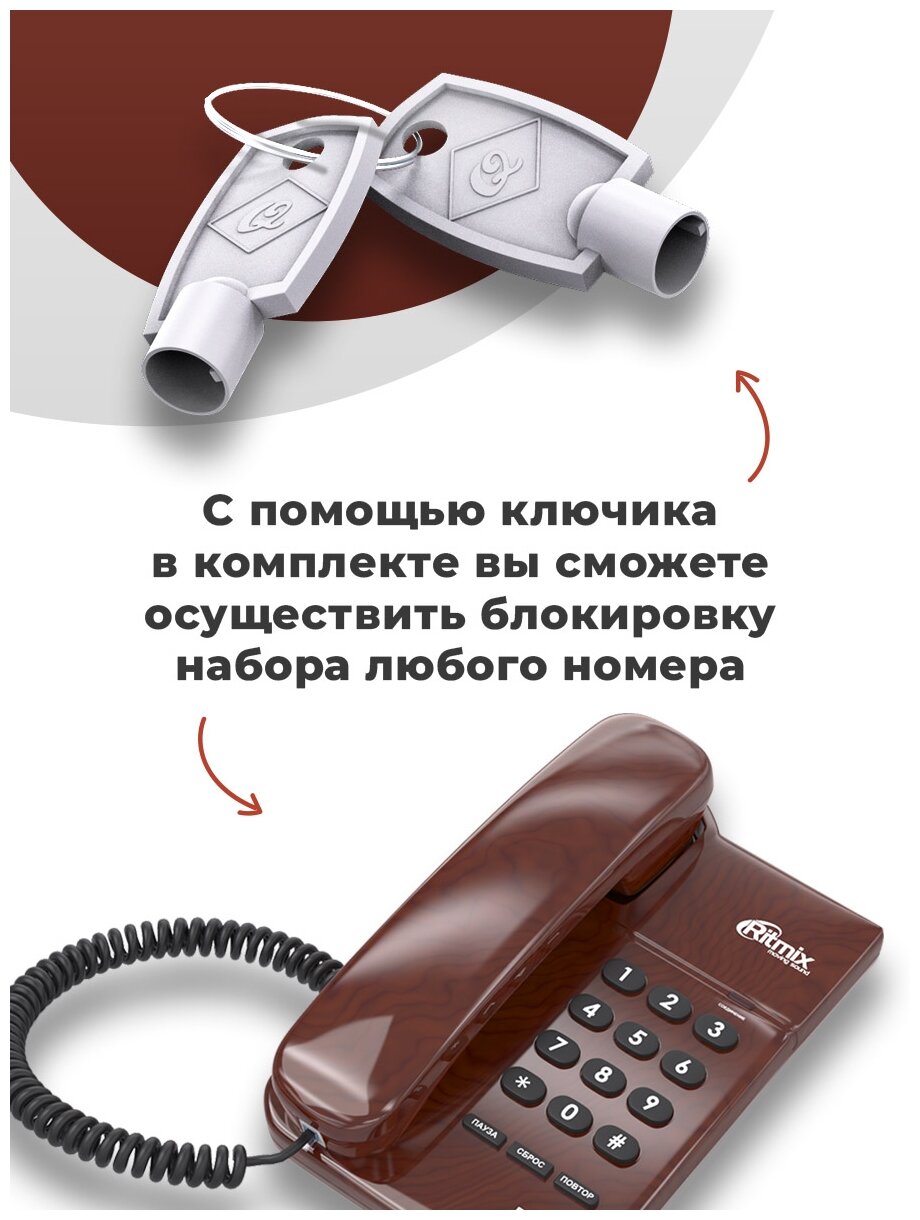 Ritmix поддерживает все основные функции, в том числе повтор набранного номера и световую индикацию соединения. С помощью ключика в комплекте вы сможете осуществить блокировку набора любого номера (разъём для него находится на задней стороне телефона; красный индикатор - блокировка включена, зелёный - выключена).