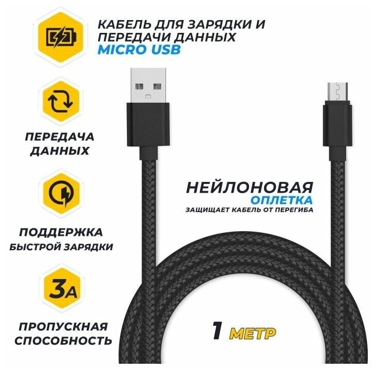 Кабель поддерживает функции заряда и синхронизации с компьютером и совместим с гаджетами с разъемом microUSB. Длины кабеля в 1 метр хватит для подзарядки девайса и одновременной работы за ним.