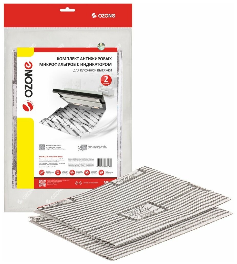 Важно помнить, что кухонная мебель часто производится из спрессованных опилок, покрытых тонким шпоном «под дерево», которые под воздействием высоких температур и испарений быстро портятся.Кроме того, от жирных испарений, образующихся при приготовлении пищи, на потолке образуются жёлтые пятна, а газовые трубы и стены покрываются жирным налётом. Чтобы избежать этих неприятностей, на любой кухне рекомендуется устанавливать вытяжку.Различают воздухоотводные и рециркуляционные вытяжки.В воздухоотводных обычно установливается только один фильтр – антижировой, чтобы жирные испарения не оседали на двигателе.В рециркуляционных вытяжках воздух просто проходит фильтрацию, требует более тщательной очистки, поэтому вместе с жировым фильтром устанавливается угольный.Представленный комплект антижировых универсальных микрофильтров российского бренда Ozone включает в себя два изделия.Предназначен для кухонной вытяжки.Индикатор загрязнения на микрофильтрах позволяет легко и своевременно производить его замену.Подходит для всех типов вытяжек с размером микрофильтров 550х470 мм.