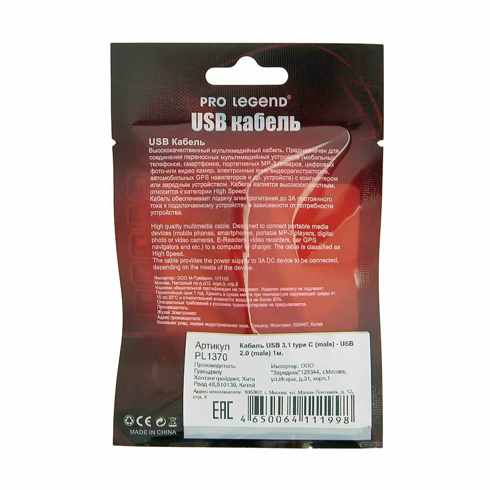 На сегодняшний день товар «Кабель USB Pro Legend 3.1 type C (male) - USB 2.0 (male) 1м.» можно купить с кешбеком в 1 магазине: Яндекс.Маркет
