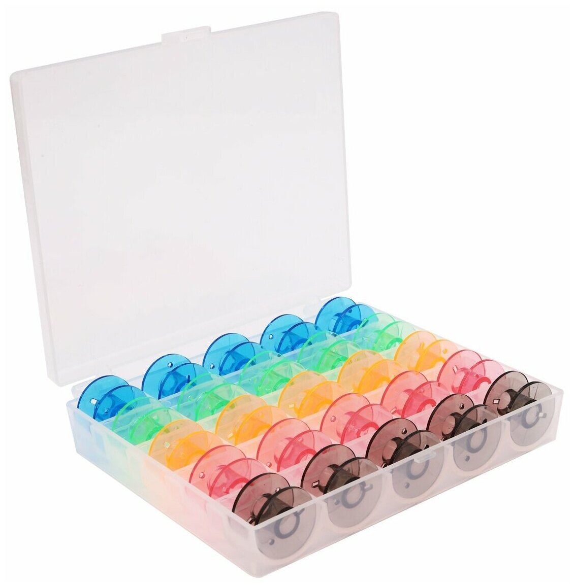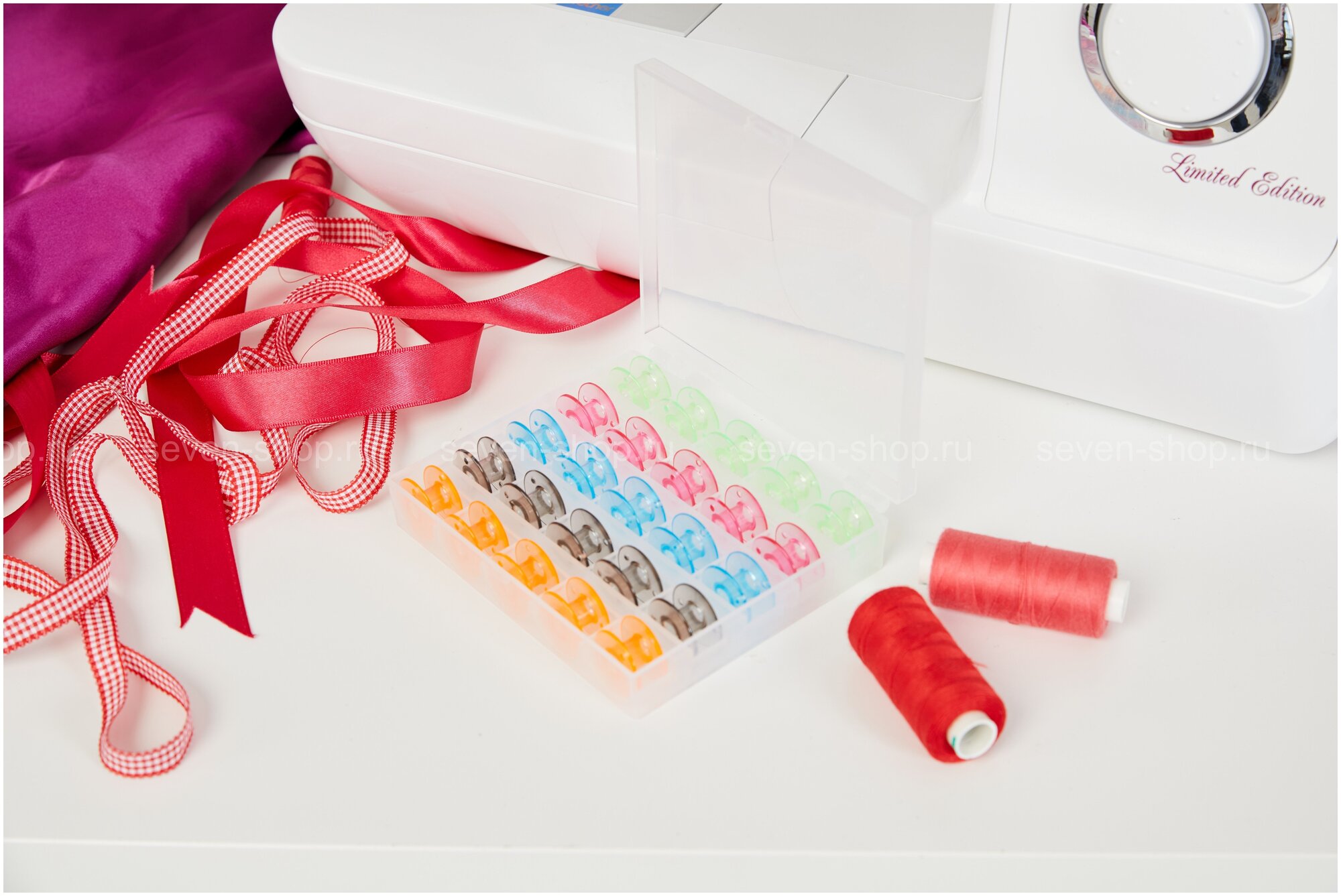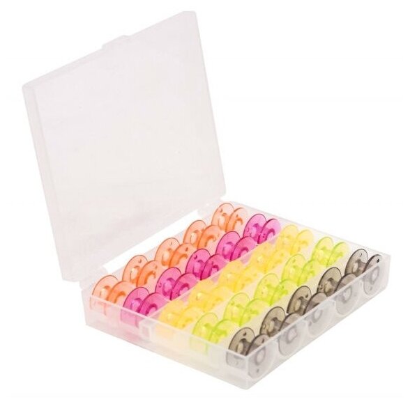 Прозрачные шпульки ярких цветов для швейных машин в наборе 25 штук.5 цветов по 5шт: голубой, зеленый, оранжевый, розовый, серый. Упаковка: бокс - контейнер для хранения пластиковый.Контейнер - бокс для шпулек - удобный аксессуар для хранения шпулек для шитья на швейной машинке. Аккуратная прозрачная коробочка с крышкой, материал - пластик, в которой можно хранить раздельно шпульки с нитками разных типов и цветов. Шпульки в боксе - аккуратное компактное хранение и удобство в работе.Шпульки подходят для современных бытовых швейных машин как с вертикальным, так и с горизонтальным челноком.