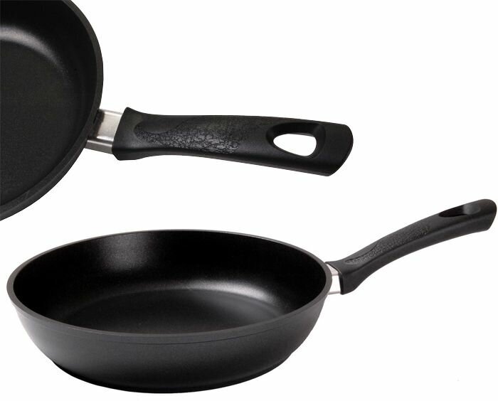 Литая толстостенная сковорода с 5-ти слойным мраморным антипригарным покрытием. Толщина стенок и дна 6 мм, можно не бояться за деформацию сковороды. Она довольно увесистая, не скользит по поверхности плиты. Сковорода подходит для газовых, стекло-керамических и электрических плит. В посудомоечной машине мыть нельзя. Готовить одно удовольствие на такой сковороде. Рекомендую к покупке.