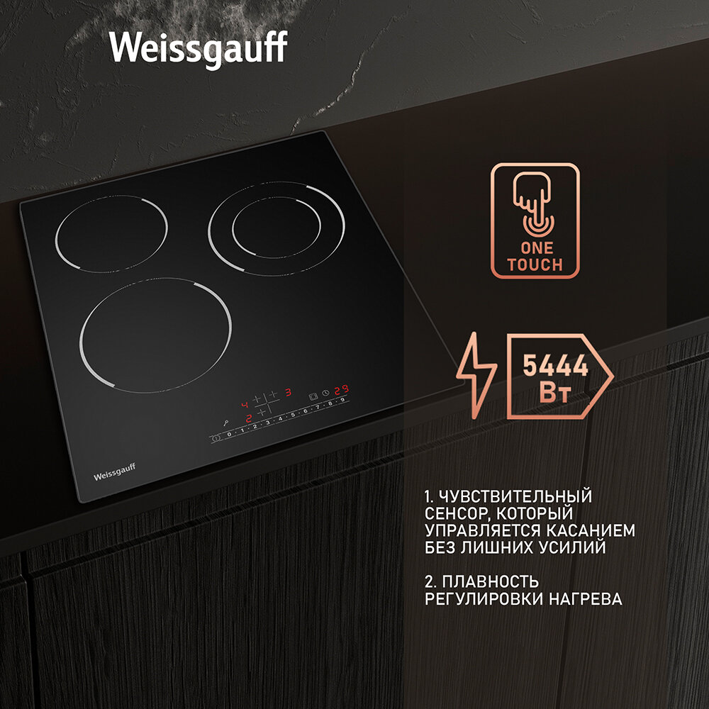 Встраиваемая электрическая панель WEISSGAUFF – расширенные возможности в одной модели! Hi-Light панель с тремя конфорками сочетает в себе компактность и функциональность: вы всегда имеете в своем распоряжении три активные рабочие зоны, и при этом данная панель не занимает много места. 9 уровней мощности, с которыми вы сможете подобрать подходящую температуру для приготовления практически любого блюда. Слайдер, позволяющий всего в одно касание выставить необходимый вам уровень нагрева любой из конфорок.