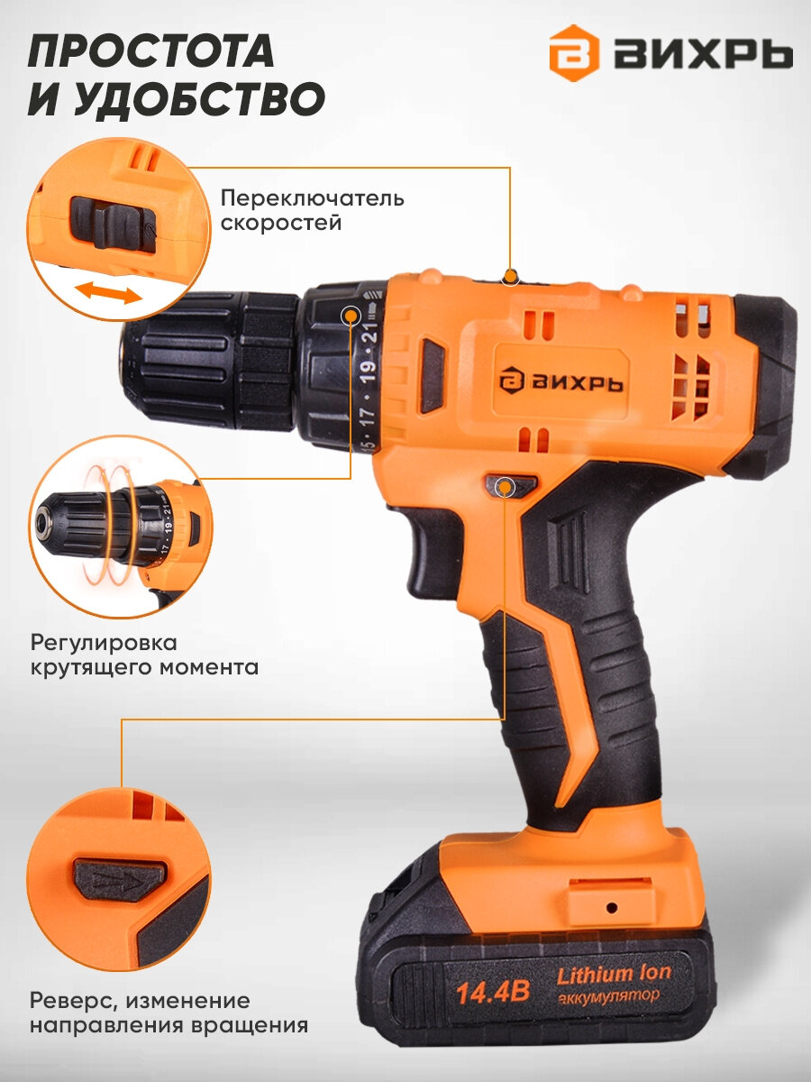 - Дрель аккумуляторная ВИХРЬ ДА-14,4-2к