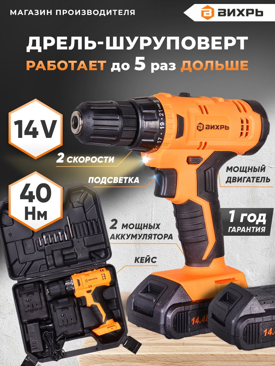 Дрель аккумуляторная ВИХРЬ ДА-14,4-2к