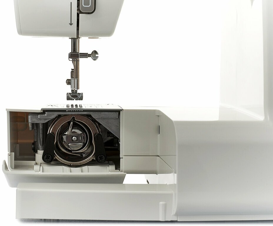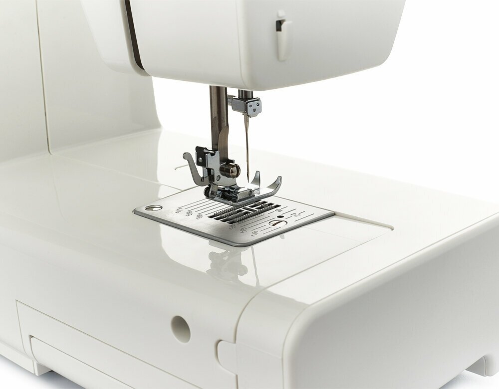 Швейная машина выполняет 19 швейных операций, в том числе потайные, декоративные, трикотажные и оверлочные строчки. Максимальная длина стежка составляет 4 мм, а ширина - 5 мм. Функция реверса поможет быстро закрепить строчку.