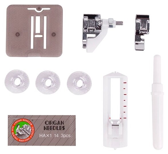 | Комплект поставки | Большая отвертка; Лапка для автоматической петли ( R ); Лапка для втачивания молнии; Лапка для потайного шва; Лапка универсальная (А); Набор игл; Прозрачные шпульки - 2 шт; Распарыватель |