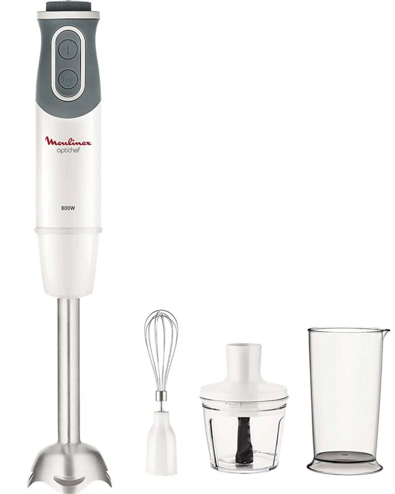 | Прочие свойства и особенности | Насладитесь оптимальным процессом и идеальным результатом с погружным блендером от Moulinex. Специальный дизайн насадки и форма лезвий обеспечат невероятно легкую работу с прибором, в то время как практичная защита от брызг сделает процесс приготовления более комфортным. Полностью контролируйте процесс приготовления с помощью высококачественного мотора мощностью 800 Вт и 10 скоростных режимов, которые можно переключать, не прерывая легкое и интуитивно понятное управление прибором. Также блендер оснащен нескользящей ручкой и съемными частями, которые можно мыть в посудомоечное машине. В дополнение к блендеру идут мерный стаканчик объемом 800 мл и измельчитель объемом 500 мл для легкой и удобной нарезки различных ингредиентов и венчик для взбивания. |