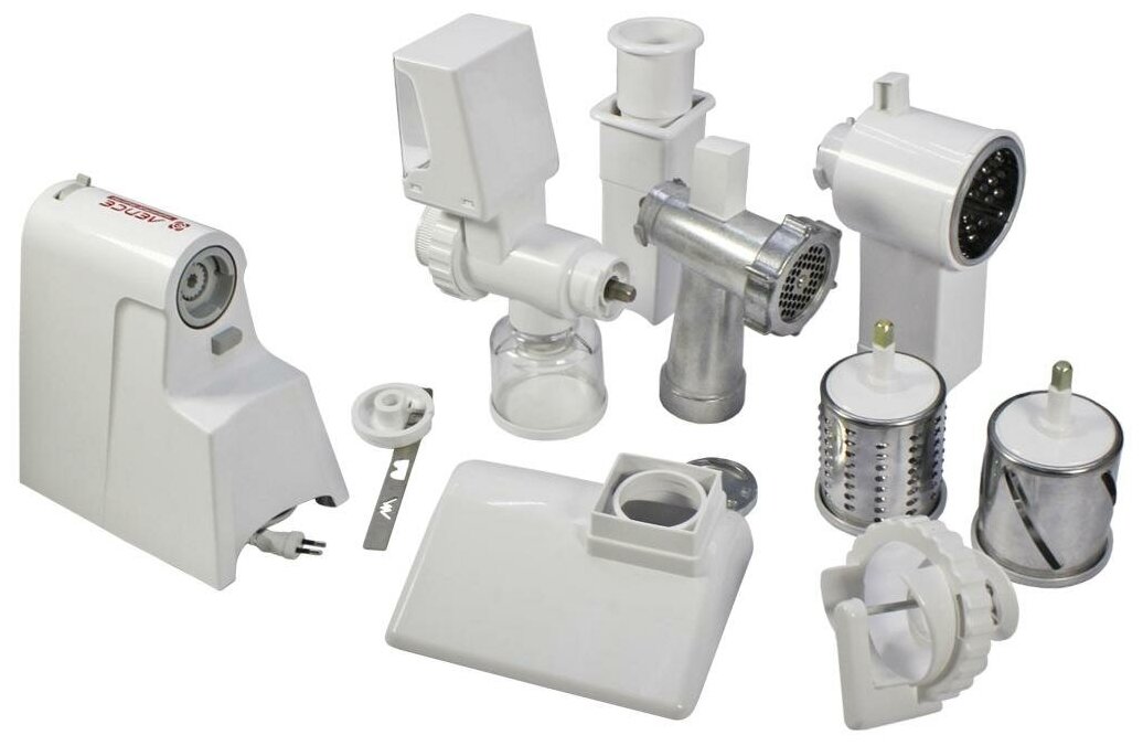 | Комплект поставки | Мясорубка, насадка для измельчения мяса, овощерезка для резки и шинковки овощей, фруктов, сыра и орехов (3 вида нарезки), насадка для приготовления мяса типа «беф-строганов»; насадка для помола кофе, насадка для профилирования песочного теста для печенья, насадка для профилирования пельменного теста, документация |