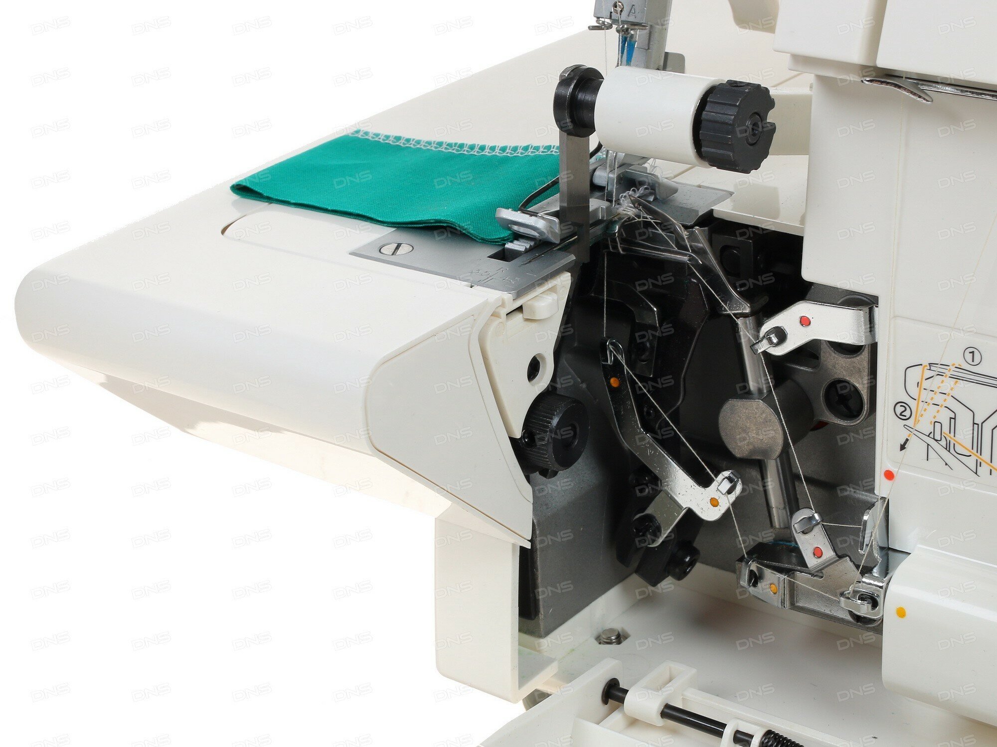 В данной модели предусмотрена диодная подсветка рабочей зоны. Есть помощник заправки нижнего петлителя и съемная рукавная консоль. Для удобного и надежного расположения есть специальные присоски. Вес модели без упаковки – 7,2 кг.