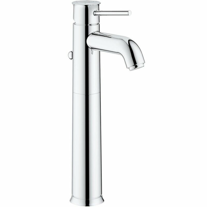 Смеситель Grohe BauClassic для раковины, хром Смеситель Grohe BauClassic для раковины со сливным гарнитуром. Однорычажный смеситель с керамическим картриджем для свободностоящих раковин. Встроенный аэратор позволяет с большим комфортом пользоваться смесителем, насыщая струю воды воздухом, тем самым уменьшая брызги и сокращая расход воды. Гибкая подводка и система быстрого монтажа значительно упрощают установку смесителя.