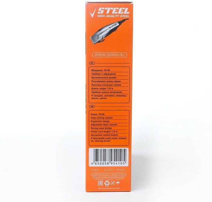| Прочие особенности и свойства | Машинка для стрижки CENTEK CT-2109 имеет высококлассные лезвия, которые надолго остаются острыми, обеспечивая превосходные результаты стрижки. Прибор имеет эргономичную форму, которая обеспечивает легкое и комфортное движение прибора и не травмирует кожу головы. Представленная машинка идеально подойдет как профессиональным парикмахерам, так и любителям. ,,Тип двигателя:вибрационный,Число установок длины:5,Способ регулировки длины |