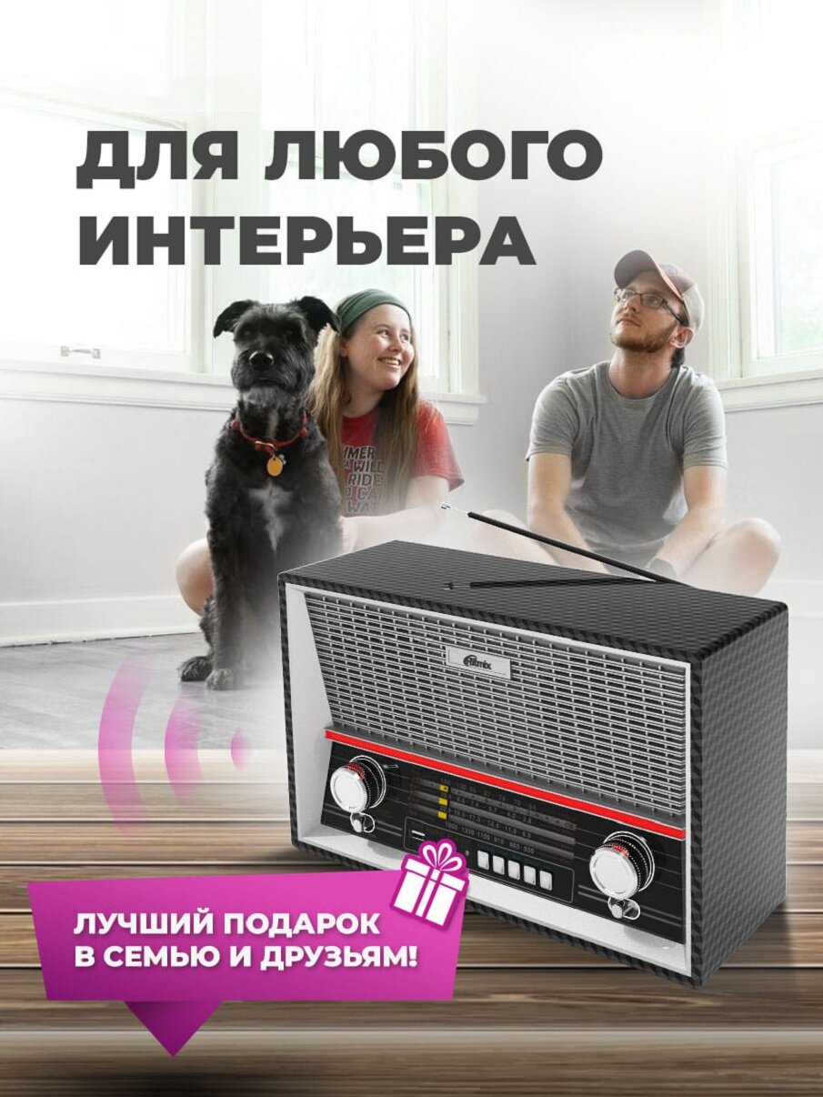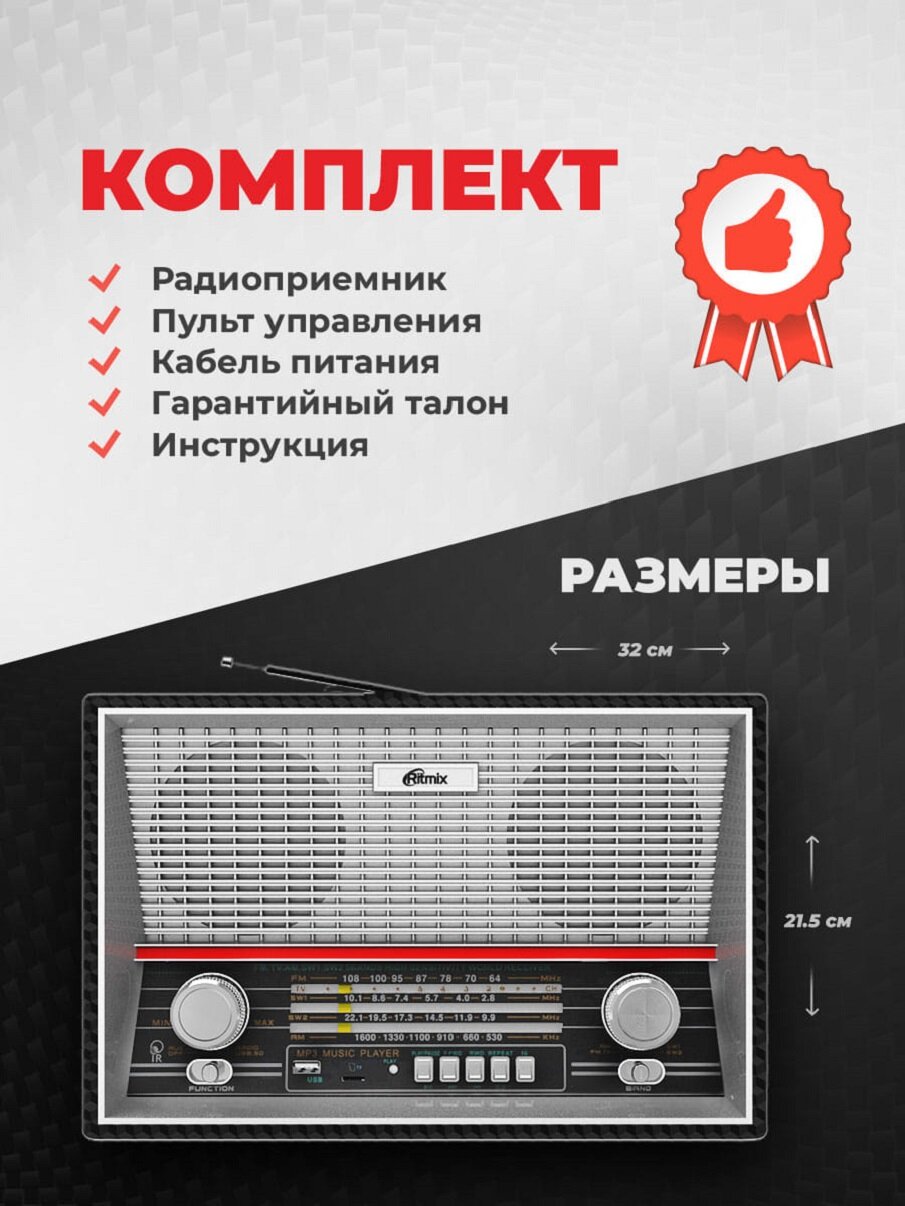 | Прочие особенности и свойства | Ritmix RPR-102 — полноразмерный радиоприёмник в ретро-стиле. Устройство работает на четырёх диапазонах, включая FM. Дополнительная функция RPR-102 — воспроизведение MP3-файлов с карт памяти MicroSD или USB-флэшки. Поставляется в двух цветовых исполнениях:карбон и бук.,,Ретро-стиль,Два динамика — стереозвук,Два цвета:карбон и бук,Телескопическая поворотная антенна,Четыре диапазона приёма |