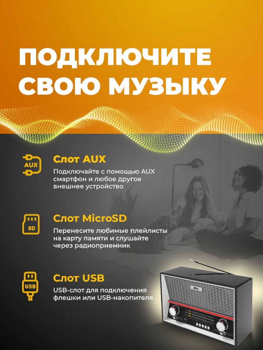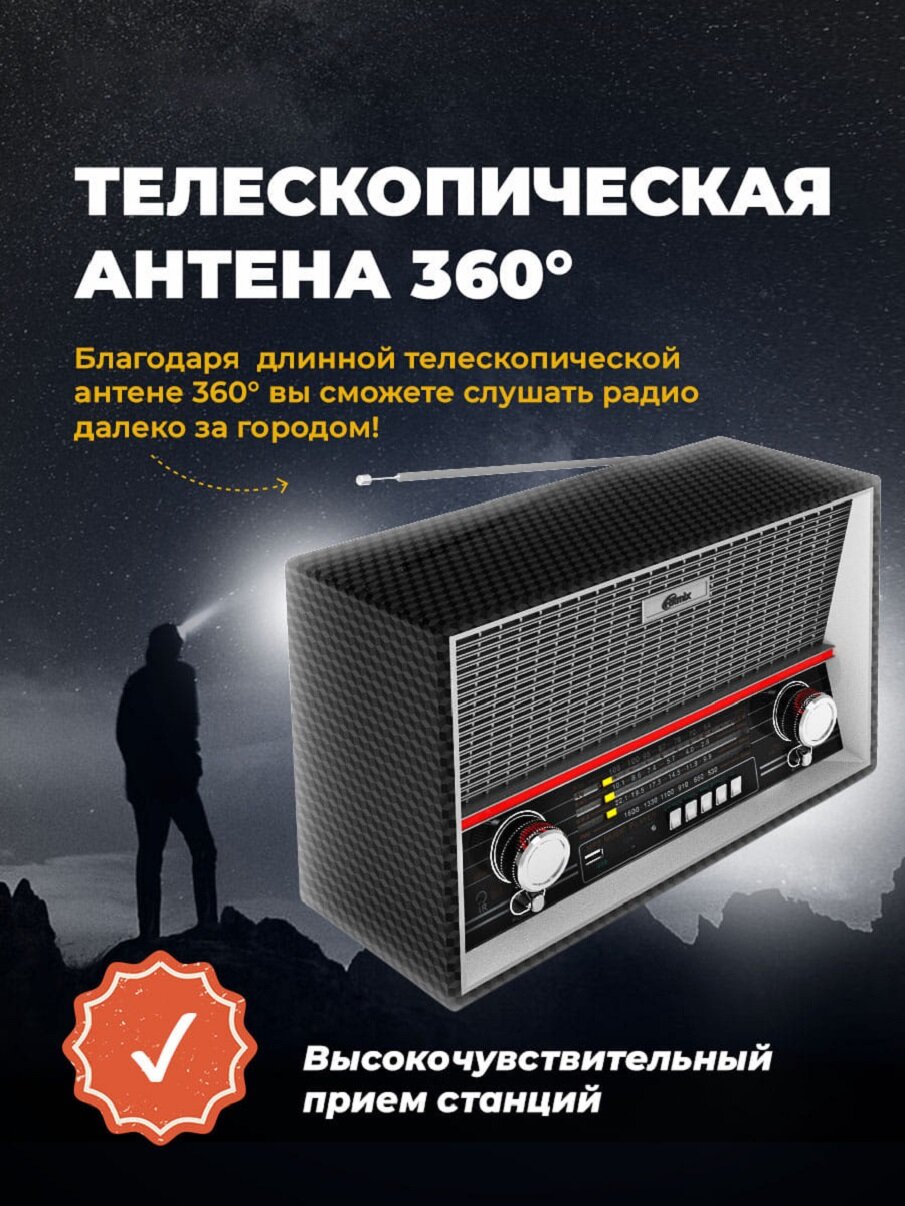 - В первую очередь, неожиданно громкий и чистый звук музыки с флэшки. Дизайн в стиле "Ретро". Наличие собственного аккумулятора.