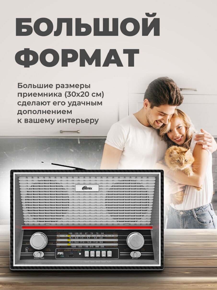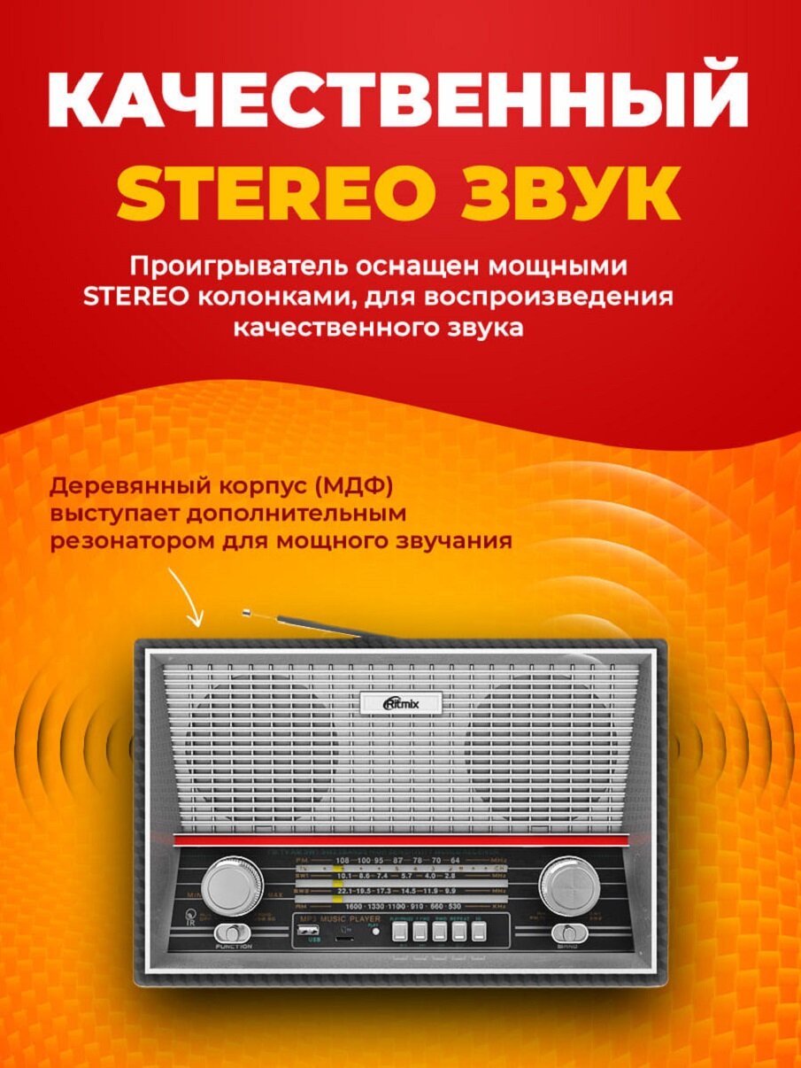 Радиоприёмник Ritmix - это полноценная современная стерео-система с встроенным MP3-плеером, выполненная в ретро-дизайне, имитирующем полноразмерные радиоприёмники 50-х.