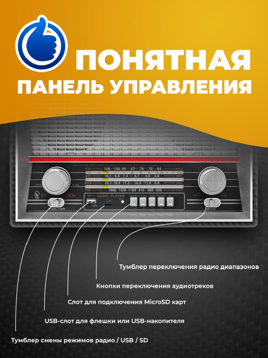 | Особенности | Четырехдиапазонное ФМ/КВ1/КВ2/СВ радио ФМ 64108 МГц с разъемом для наушников, AUX вход, с разъемом ЮСБ/microSD, дистанционное управление, два динамика, встроенный МП3плеер,встроенная батарея, Питание 220В 50МГц / 9В 1.2А / батареи типа Дх6шт не в |
