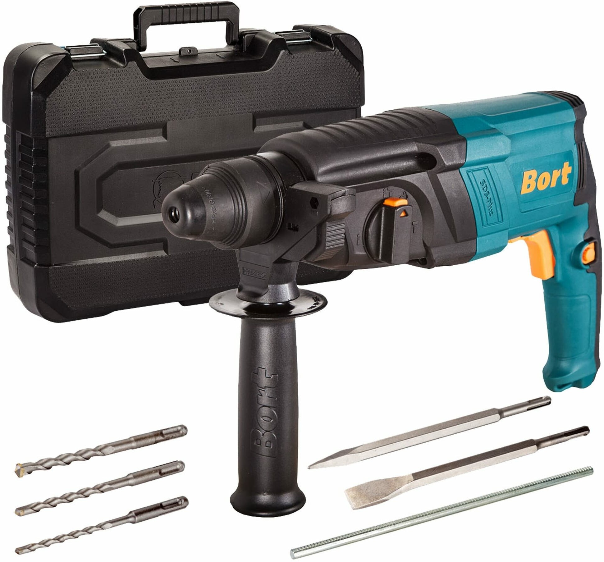 В комплект входят буры и пики. Перфоратор с принадлежностями идет в комплекте с практичным и прочным кейсом.
