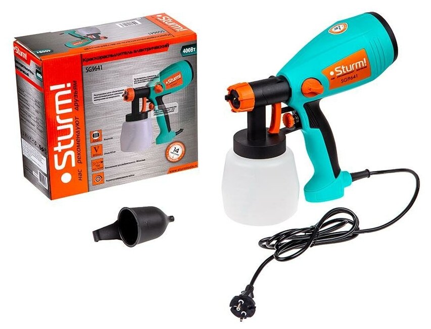 Краскопульт STURM SG 9641 электрический Электрический краскораспылитель STURM SG 9641 представляет собой оборудование, с помощью которого производится покраска поверхностей разнообразными материалами (вязкость которых не должна превышать 35 DIN). Высокая производительность в 700 мл/мин позволит обеспечивать высокую скорость покраски, а функция подстройки скорости распыления даст возможность отрегулировать инструмент под свои нужды.
