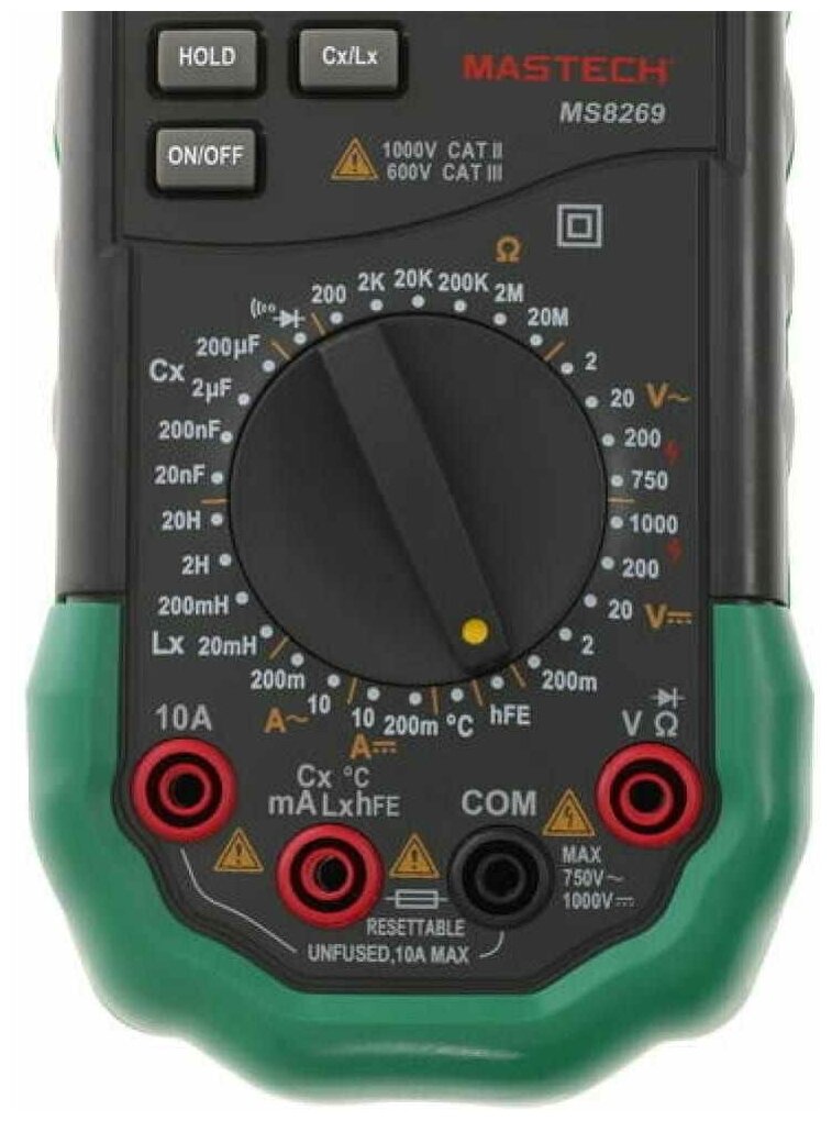 | Описание | Мультиметр Mastech MS8269 обладает привычными большинству пользователей органами управления: устройство оснащено кнопочной панелью и переключателем поворотного типа. Прибор, относящийся к профессиональному классу, позволяет измерять основные параметры цепи. Предусмотрены и функции измерения температуры, проверки диодов и проверки целостности цепи., , Мультиметр Mastech MS8269 способен производить 2 измерения в секунду. Базовая погрешность устройства не превышает 0.5%. Прибор получает питание от 4 элементов питания AA, роль которых могут играть батарейки и аккумуляторы. Масса прибора равна 390 г. Мультиметр будет несложно носить и возить с собой даже в небольшой сумке. , , Коэффициент усиления транзисторов h21: есть, Единицы счета |