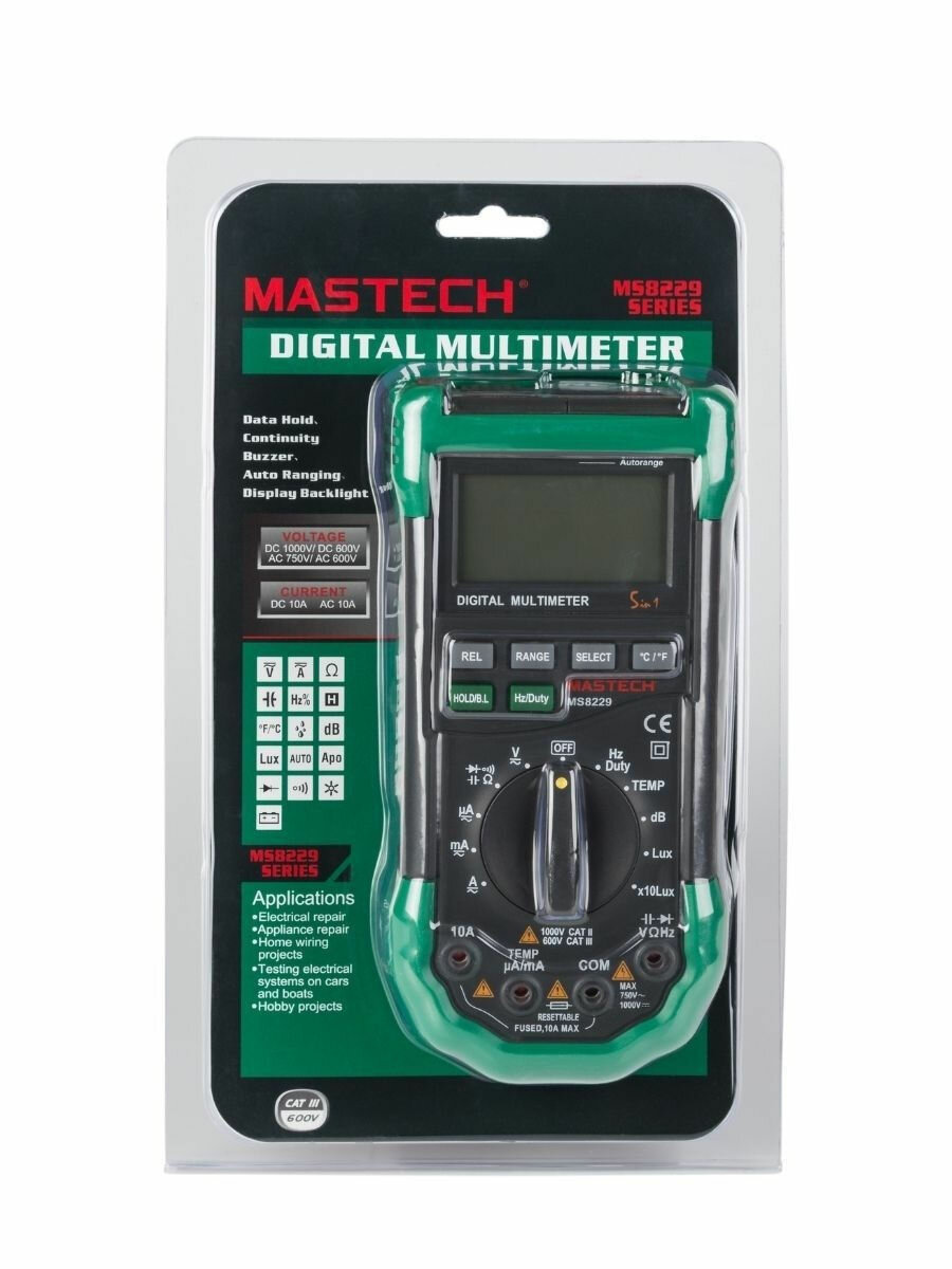 Профессиональный мультиметр MS8229 MASTECH 5-в-1 с автовыбором диапазонов. Революционный по своим возможностям цифровой мультиметр объединяет в себе сразу пять измерительных приборов с отличными характеристиками. Помимо основных функций мультиметра (измерения величин силы постоянного и переменного тока, постоянного и переменного напряжения, сопротивления), MS8229 позволяет измерять температуру, влажность, уровень звукового поля и уровень внешней освещенности. С помощью цифрового мультиметра MS8229 можно тестировать полупроводниковые диоды и прозванивать электрические цепи.