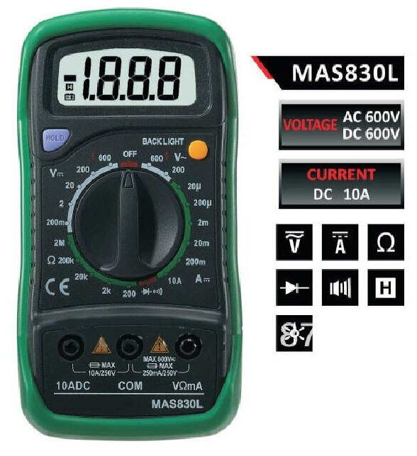 Мульти́метр — электроизмерительный прибор, который включает в себя несколько функций и набор измеряемых параметров. Все приборы серии MAS830 измеряют постоянное и переменное напряжение, постоянный ток и сопротивление в цепи. С помощью данного прибора можно проводить тестирование диодов.