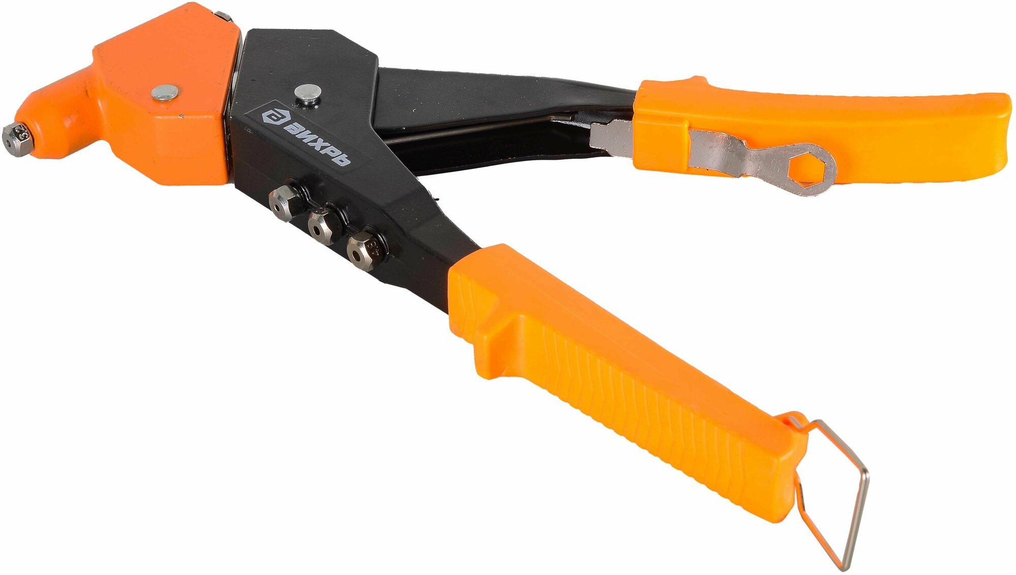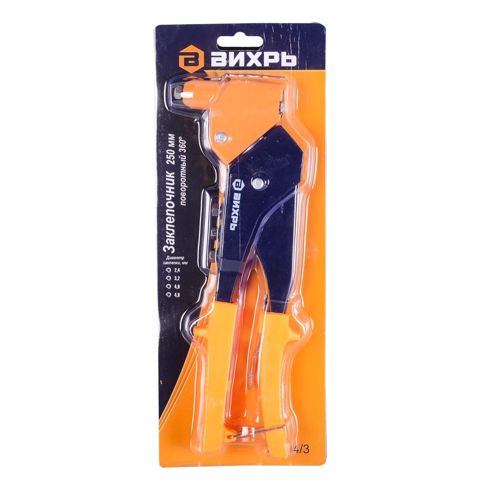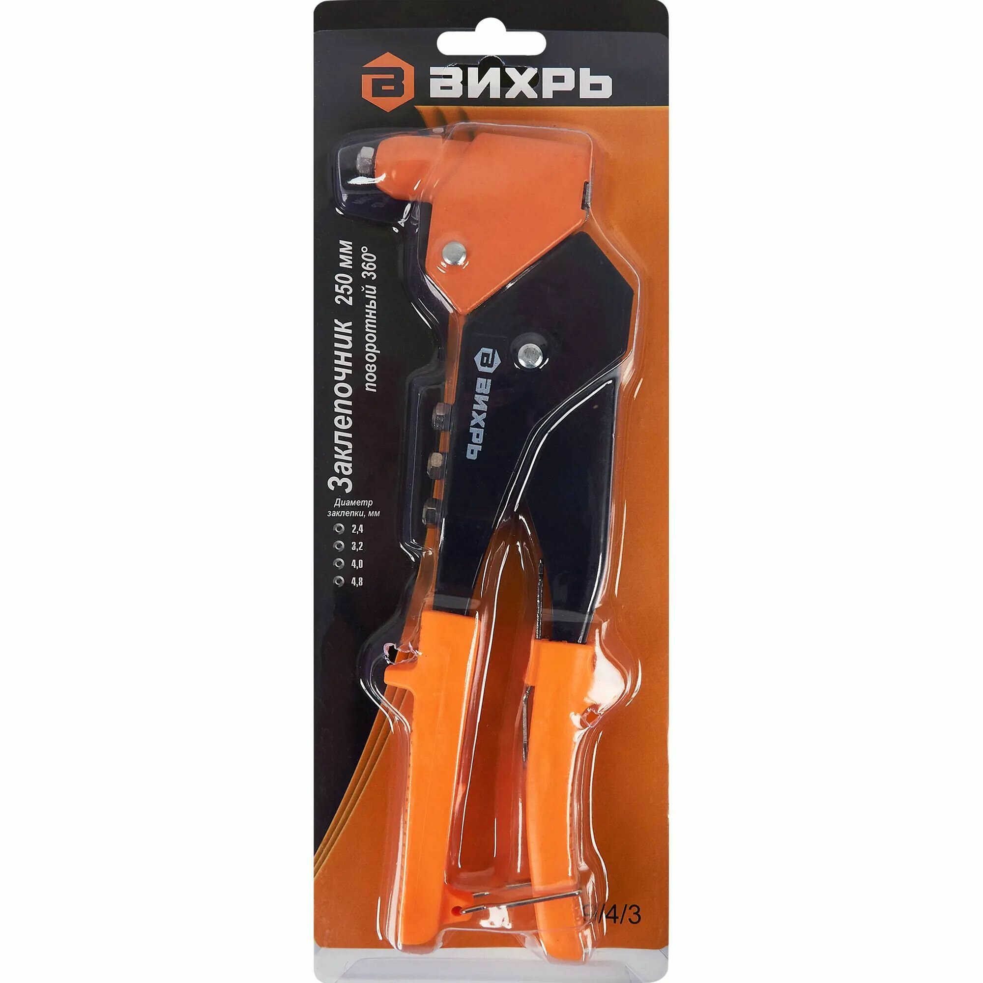 Поворотный заклепочник 250 мм, Вихрь - простой и удобный в работе ручной инструмент для скрепления различных материалов при помощи заклепок размерами: 2.4, 3.2, 4, 4.8 мм. Изделие совместимо с заклепками из стали, алюминия, нержавеющей стали и меди.