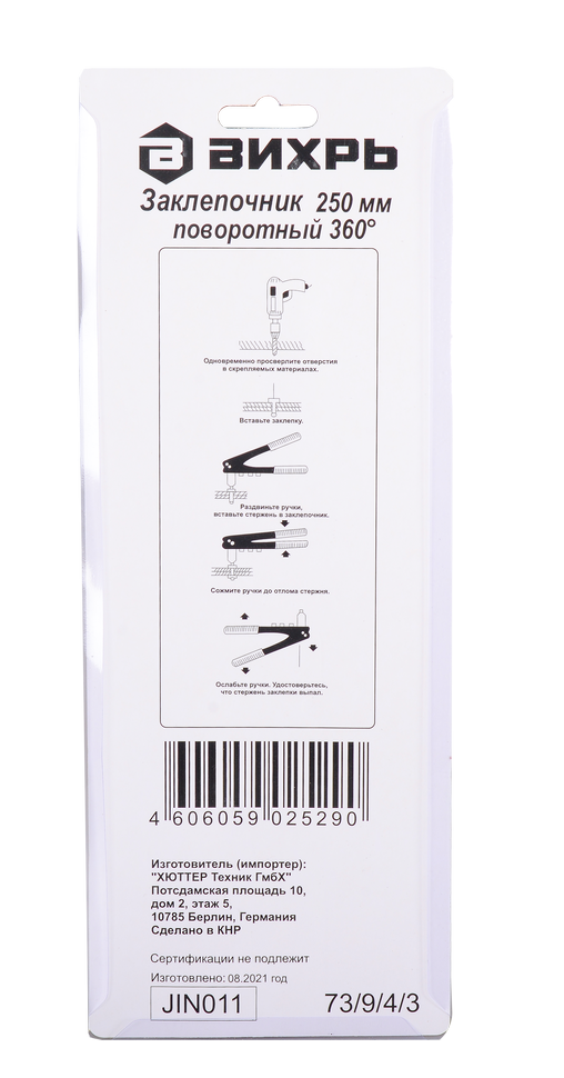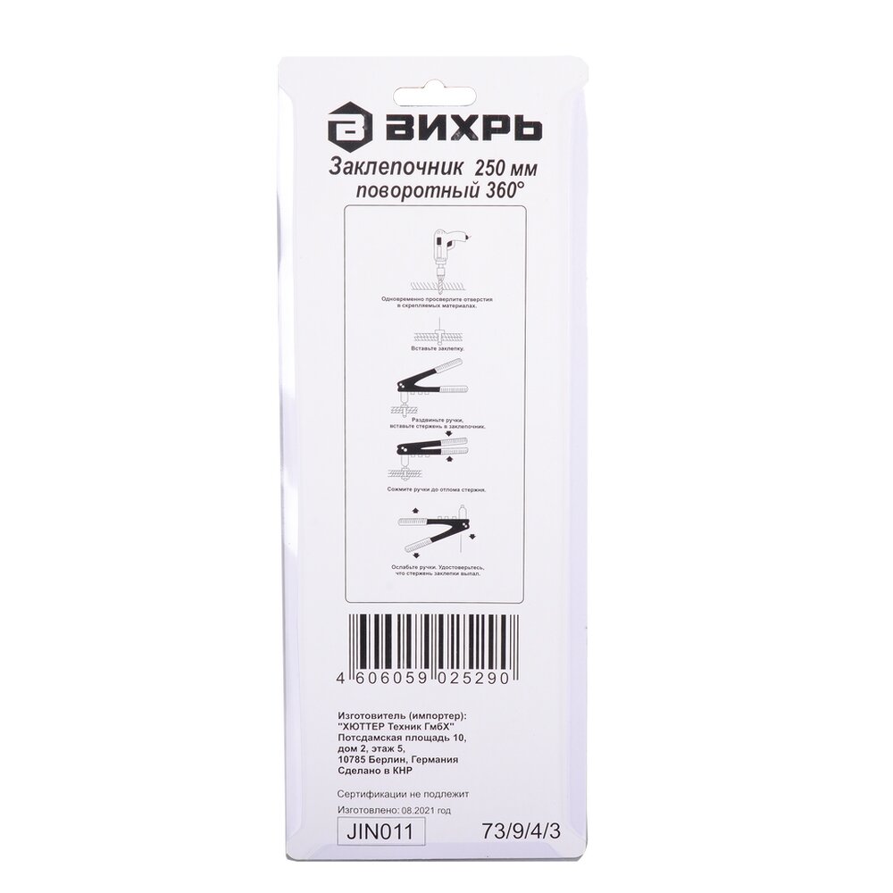 | Применение продукта | Заклепочник ВИХРЬ 250 мм поворотный 360 - ручной инструмент для надежного соединения деталей или нескольких слоев материала. Функция перестановки рабочей части (в положении 360 градусов) позволяет работать в труднодоступных местах. |