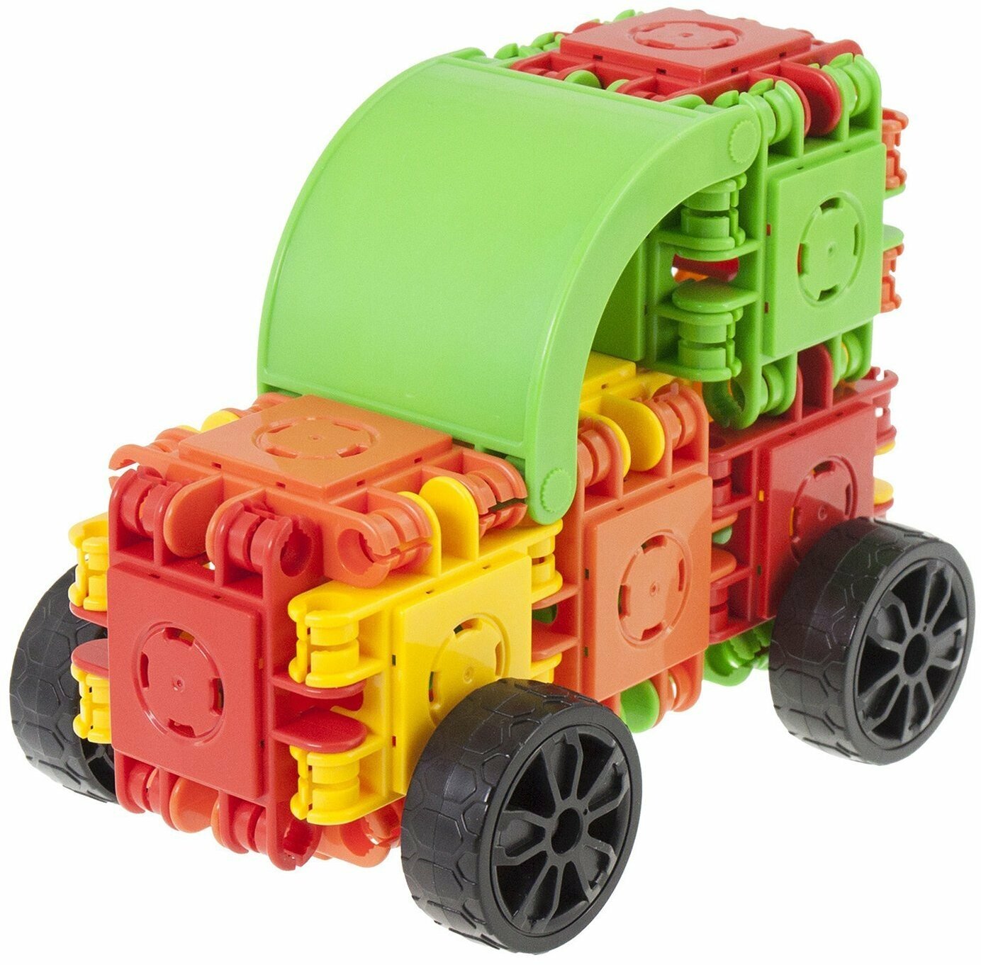 В наборе 20 основных деталей: квадраты из яркого цветного пластика соединяются под собой по разными углами. Дополнительные квадраты белого цвета крепятся на соединении сверху. Кроме них в конструкторе вы найдете колеса, декоративные элементы и яркие наклейки: все, что нужно для постройки оригинальных, реалистичных моделей. Всего в наборе 50 деталей.