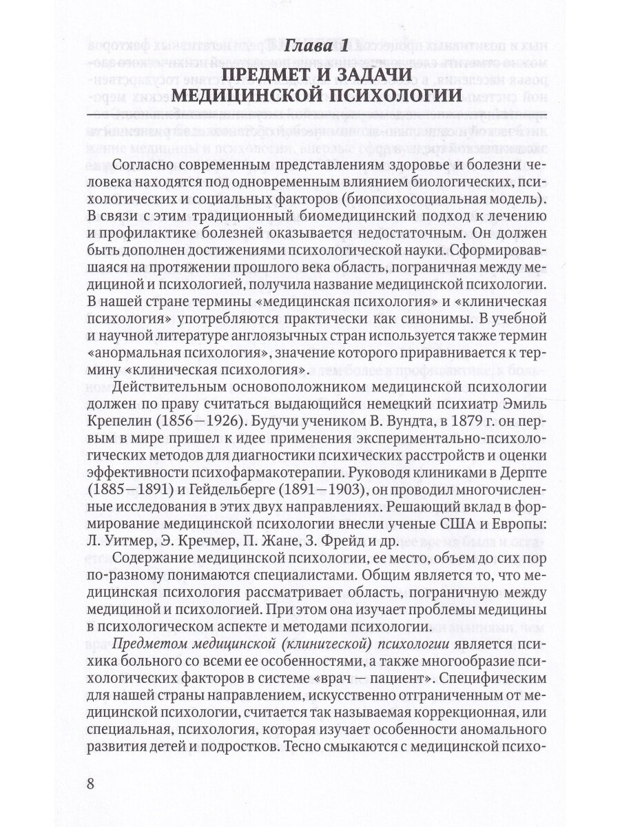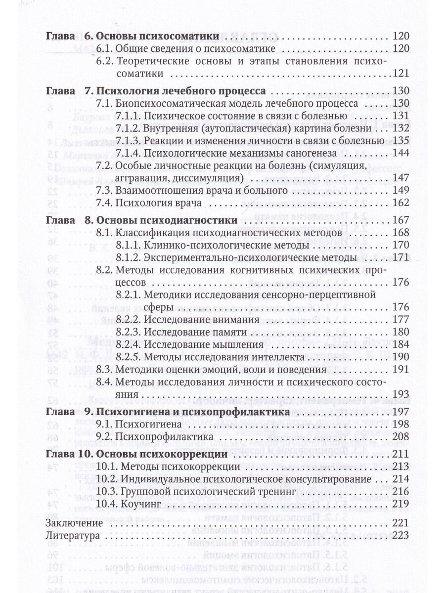 Книга подготовлена на кафедре психиатрии Военно-медицинской академии им. С. М. Кирова в соответствии с учебной программой по медицинской психологии. В ней отражены наиболее актуальные ее аспекты, предмет и задачи дисциплины, психология когнитивных, эмоциональных и волевых психических процессов в норме и патологии; описаны теории личности и интеллекта, акцентуации личности (характера), классификация психодиагностических методов; представлены подробные сведения по психологии лечебного процесса, основам психосоматики, психогигиены, психопрофилактики и психокоррекции.