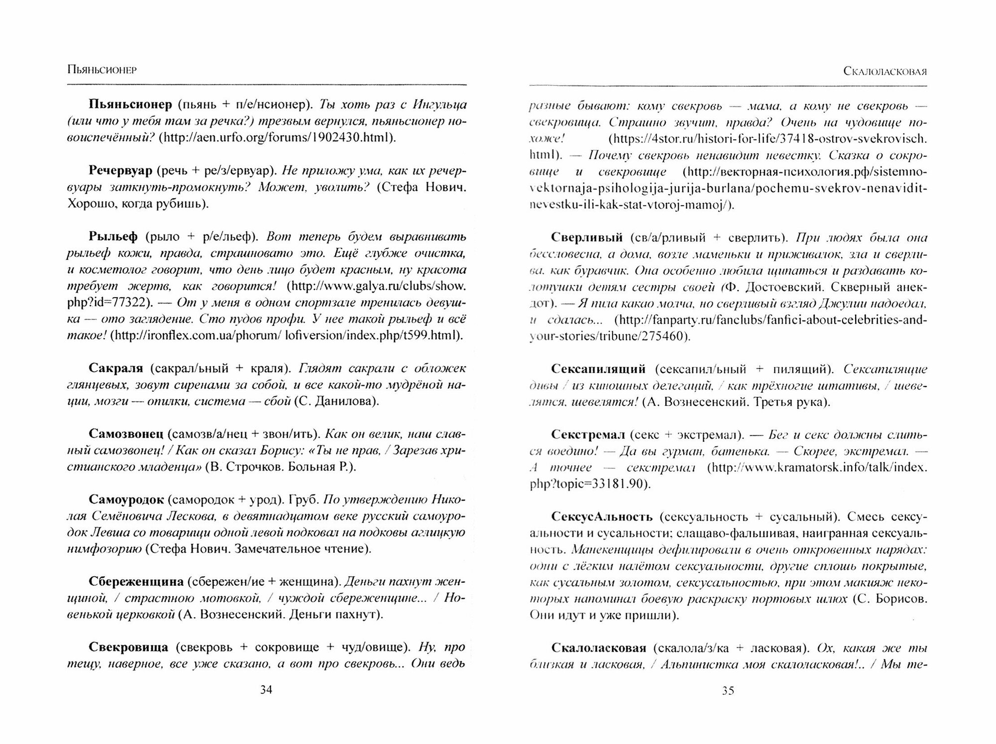 В словаре собраны слова, созданные по окказиональным моделям словообразования: контаминация, междусловное наложение, графодеривация. Слова эти объединяет игровой характер: они создавались не с целью номинации, а для привлечения внимания читателя и выражения оценки. Материал словаря отражает не только тенденции современного словообразования, но и тенденции языка: установка на игру, яркую экспрессию, оценочность. Для облегчения поиска окказионализмов в конце дан словарный указатель. Материалом для словаря послужили тексты художественной литературы, публицистики, в том числе данные Национального корпуса русского языка, сообщения и высказывания на различных сайтах и форумах.