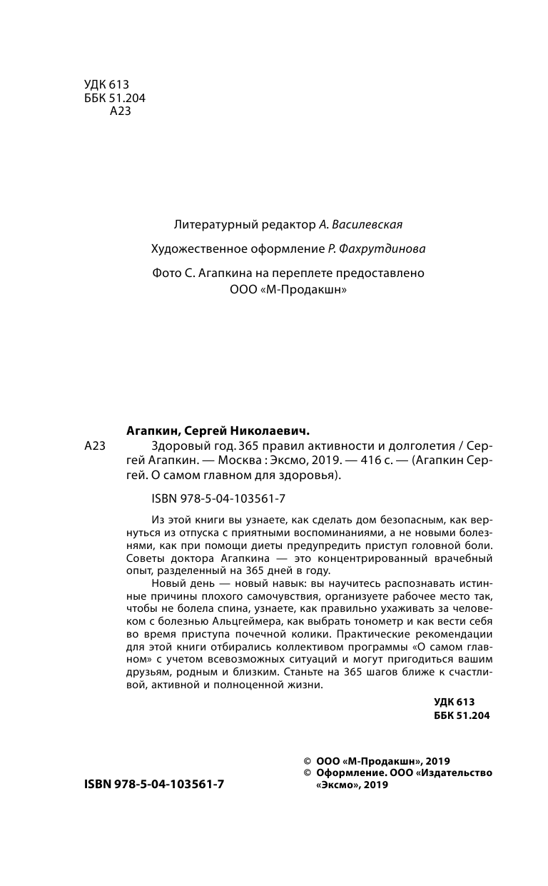 Здоровый год. 365 правил активности и долголетия (Агапкин Сергей Николаевич); Эксмо, 2019