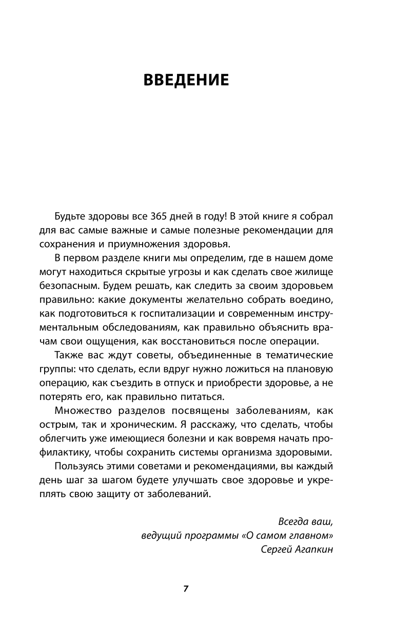 "Из этой книги вы узнаете, как сделать дом безопасным, как вернуться из отпуска с приятными воспоминаниями, а не новыми заболеваниями, как при помощи диеты предупредить приступ головной боли. Советы от доктора Агапкина – это концентрированный врачебный опыт, разделенный на 365 дней в году.