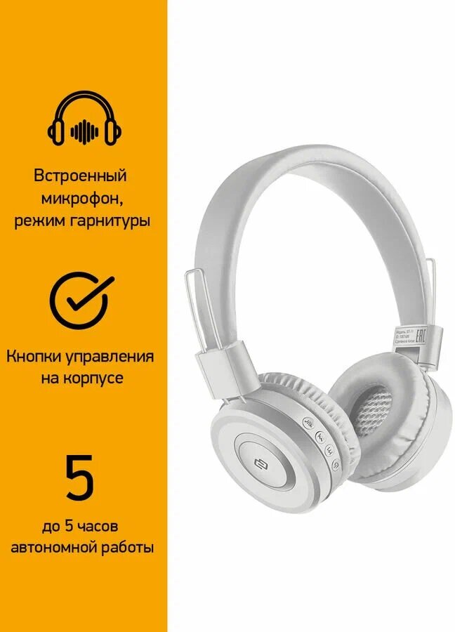 Наушники оснащены беспроводной связью, и вы с комфортом будете слушать музыку в дороге. Чувствительный микрофон будет четко передавать ваш голос собеседнику - общайтесь, не прикладывая телефон к уху!