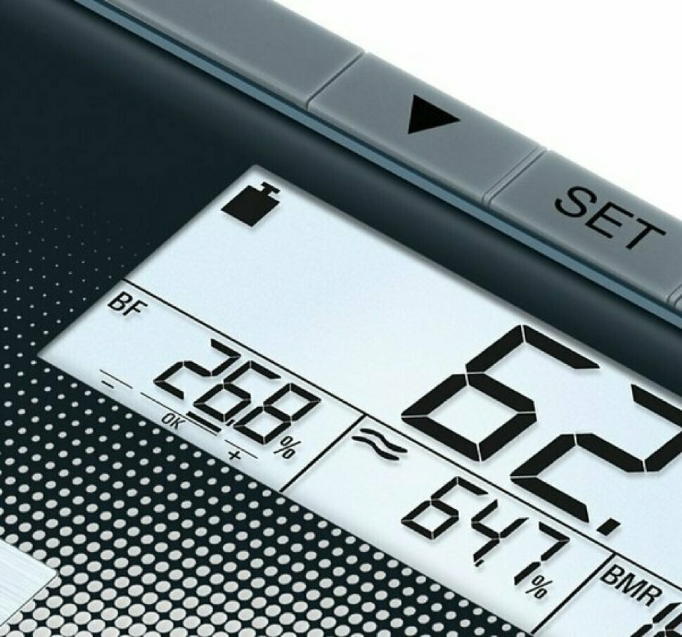 | Прочие особенности и свойства | Графический печатный мотив с прозрачным «окошком» • Большой 2-строчный ЖК-дисплей • Высота цифр (индикация веса):25 мм • Вес, жировая масса, тканевая жидкость • Индикация калорий AMR • Расчет индекса массы тела • Определение доли жира в организме • Электроды из полированной нержавеющей стали • 5 уровней активности • 10 ячеек памяти для пользователей • Индикация перегрузки • Работа от батареек |